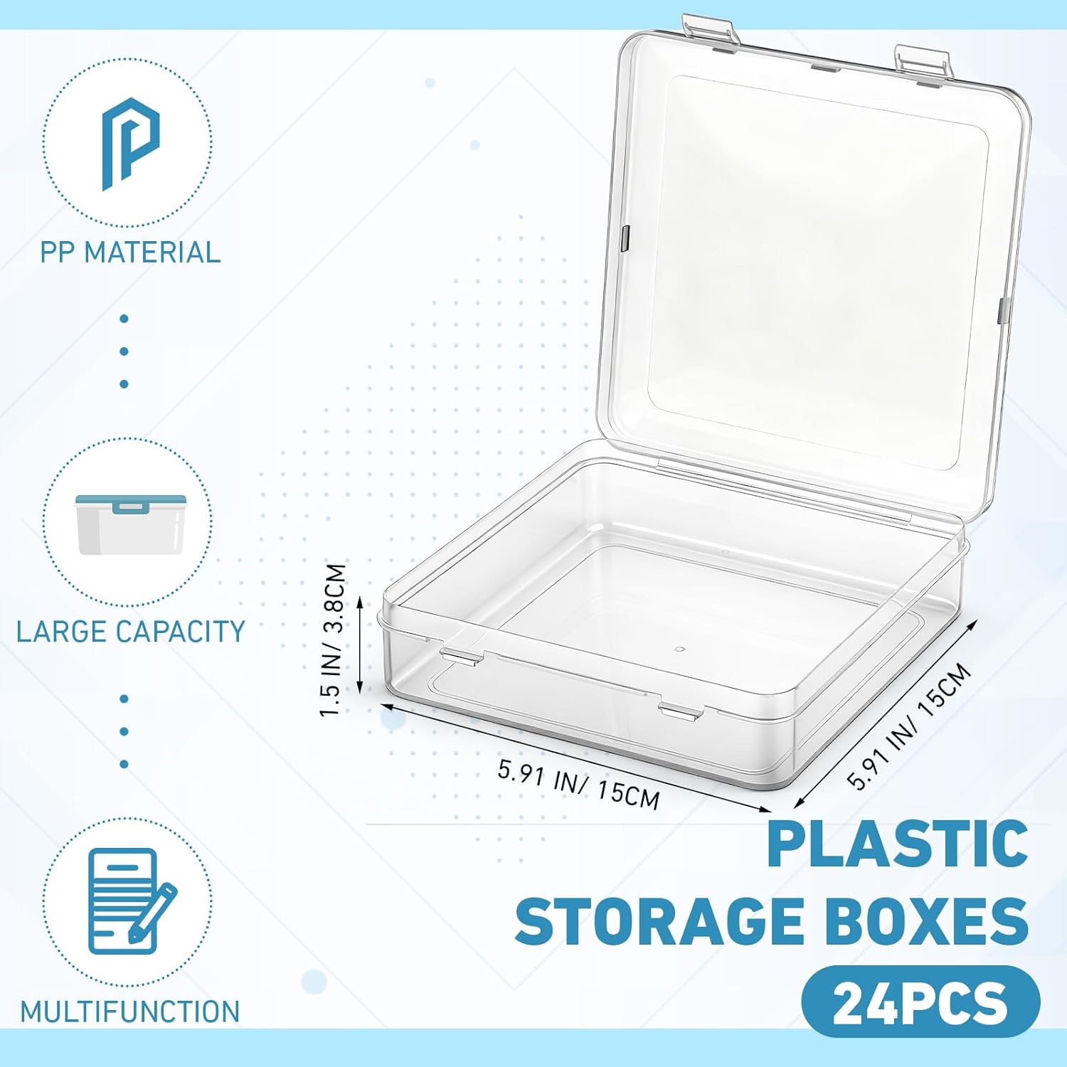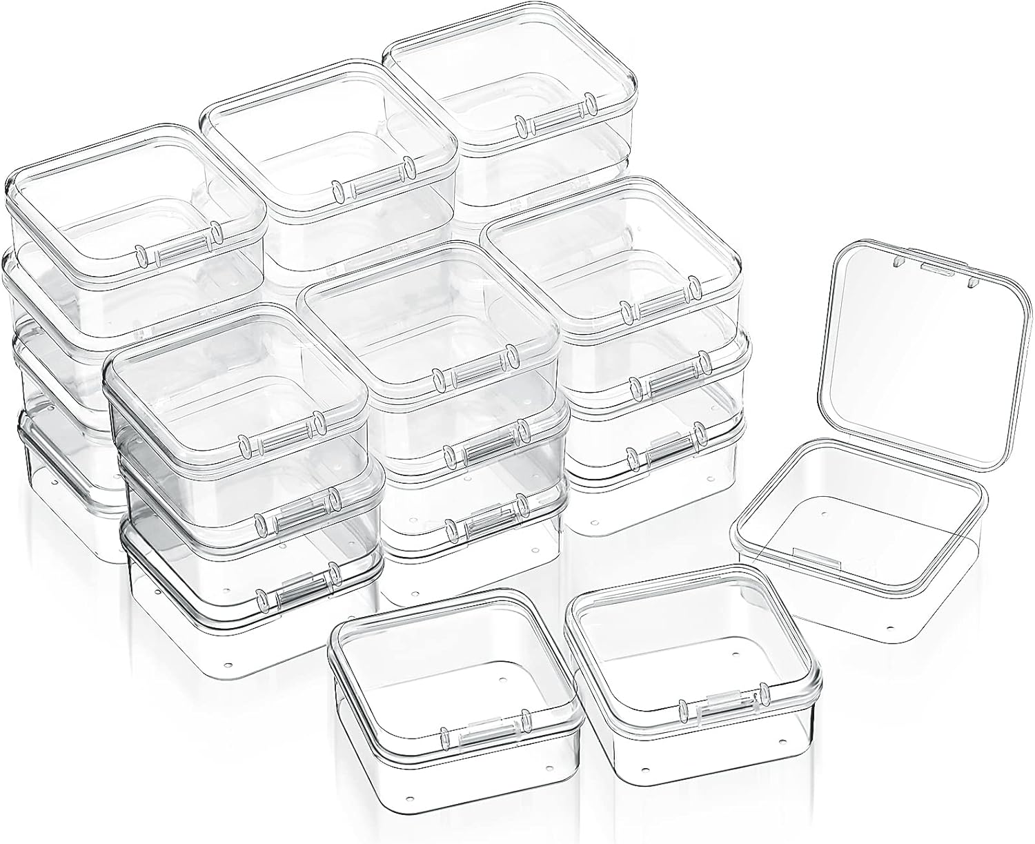 24 Packs small rectangle clear plastic box bead storage box with flip cover for crafts, tiny bead, jewelry, findings, pills, ear studs, necklace, watch parts and other small items Quality materials: These transparent plastic containers box are made of non-toxic polypropylene materials and non-fragile plastics, which is sturdy and wear-resistant, the edges are smooth and seamlessly, you can use them to store small items for a long time, not easy to break Necessary container box for life: Can be great for organizing small items, small parts, crafts, beads, coins, jewelry and watch findings. Can also be applied as hardware boxes. Parts packaging display boxes Specifications: Quantity: 24 packs Color: clear Shape: rectangular Material: plastic Size: 5.91 x 5.91 x 1.5 inches/ 15 x 15 x 3.8 cm (L x W x H) Thickness: 1 mm Package includes: 24 x Clear plastic container boxes