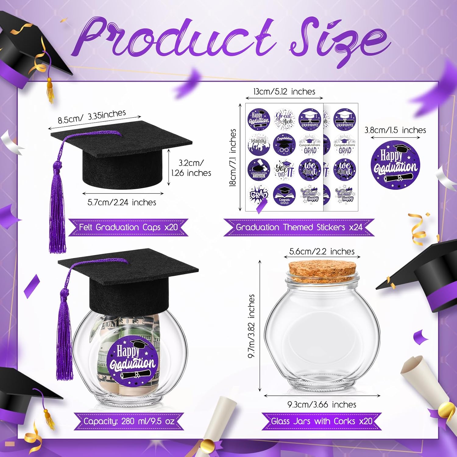 | Included Components | 20 x Corks, 20 x Felt graduation caps with red tassels, 20 x Graduation candy jar, 24 x Graduation wishes stickers |