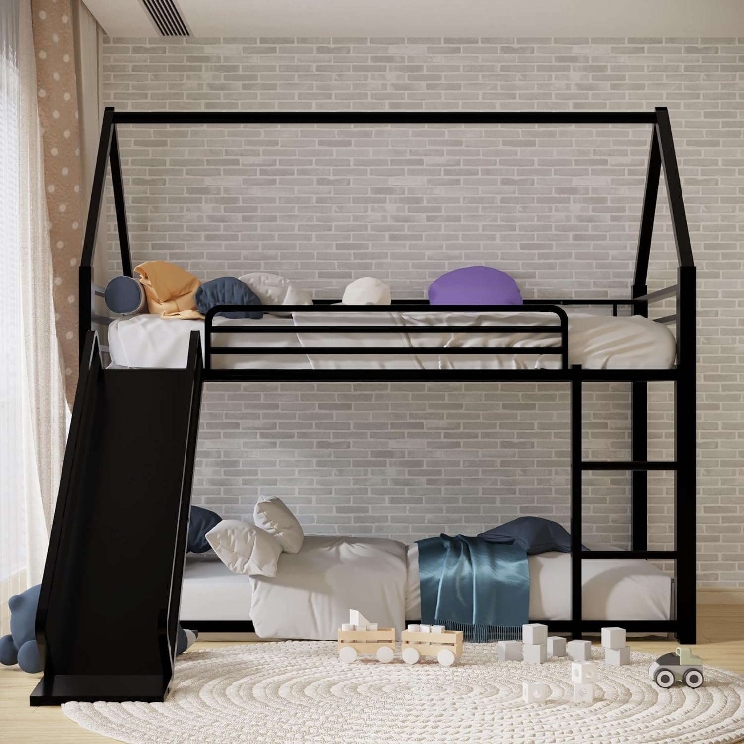 IDEAL FOR SMALL HOUSES: lower beds are low to the ground and upper beds are easy to reach. Perfect for small houses with limited space, this low profile modern bunk bed has a frame height of only 49.21".SAFE AND SECURE: The bunk bed frame includes an integrated 3-step ladder and 13" guardrails to ensure a safe upper bunk. ASSEMBLY DIMENSIONS: 76.77" L x 41.34" W x 70.87" H. WEIGHT BURDENING CAPACITY: 400 lbs. for the upper bed and 400 lbs. for the lower bed.No Box Spring Required Heavy duty metal slats support the mattress without the need for a box spring. Fixed slats and raised sides hold the mattress in place and prevent it from sliding. We also have a silent finish to ensure you get a good night's sleep. Add molding to the top of the bed to hang some items and clothing.STRONG CONSTRUCTION: Sturdy metal construction creates a stable platform bed frame that can withstand daily use. EASY ASSEMBLY: Comes with all tools and instructions, easy to understand. The bed frame can be assembled quickly. QUALITY AFTER-SALES SERVICE: You have any questions, please feel free to contact us.