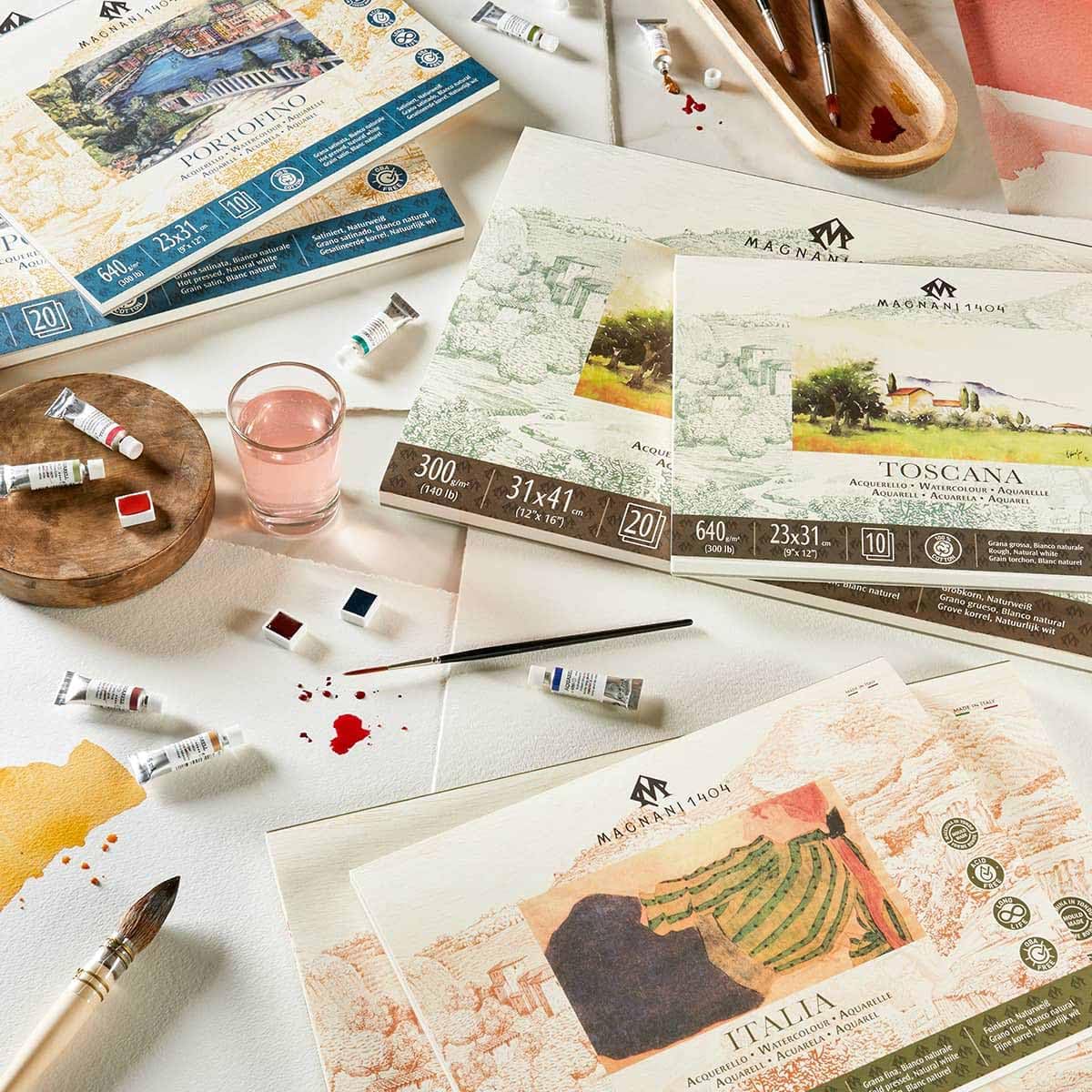 Magnini watercolour papers are made on the round sieve, using marking felts with exclusive design of the Papierwerke Magnani. This watercolour paper is characterised by the highest quality. Its composition of 100% acid-free cotton gives the paper resistance to yellowing caused by UV rays, guarantees long durability and maximum yield of the applied colours. Italia paper is suitable for all wet techniques: watercolour, gouache, ink, acrylic. Also available in the DS version: double surface sizing with slower absorption Magnani – tradition for 500 years! The MAGNANI paper mill was built in the 15th century on the banks of the Pescia River, famous for its clear water - an essential requirement for the production of paper. Already in the 18th century, MAGNANI exported its papers all over the world. Most European royalty houses and numerous state mints were among the customers. Napoleon Bonaparte commissioned MAGNANI to produce a special watermark paper for the announcement of his wedding to Maria Luisa D'Austria. The original mould is still in the factory. MAGNANI was also a supplier to the Italian royal family for special papers on which important documents were drawn up and agreements signed. Over the years, eminent artists such as Picasso, De Chirico, Guttuso, Annigoni, Maccari, Bueno, Guarnieri, Morandi, writers such as D'Annunzio, Giusti and many others had their own paper made as a token of appreciation.