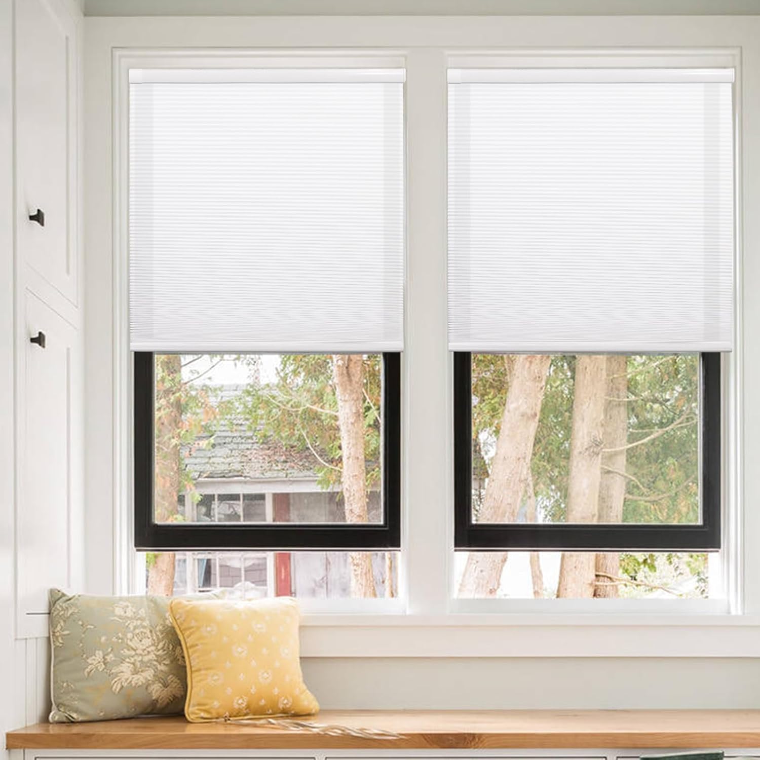 Upgrade your home with our no drill, no tools cellular shades, designed for indoor windows to offer both privacy and style without the hassle. These top down bottom up honeycomb blinds in blackout-white are perfect for any room, providing a custom fit for your windows. Easy to install and cordless, these window blinds ensure a sleek, modern look while offering the functionality of blackout roller shades. Ideal for bedrooms, kitchens, or any space needing one way privacy window film, our shades for indoor windows no drill installation make it simple to achieve a comfortable and private environment. Whether you're looking for window cover solutions, blackout shades for bedroom windows, or kitchen blinds, our honeycomb blinds offer a versatile and elegant option. Experience the convenience of no drill blinds for windows, including cordless blinds for indoor windows, temporary blinds, and blackout window cover, without compromising on style or efficiency. Choose our blackout shades for a perfect blend of functionality and modern aesthetics, ensuring your space is both private and beautifully lit. With options like black out blinds, top down bottom up shades, and faux wood blinds 2 inch cordless, our collection caters to every need, offering a seamless solution for window shades no drill required. Embrace the ease of installation and the elegance of modern window treatments with our no drill shades, including honeycomb blinds and black out window cover, designed to enhance your home's comfort and style.