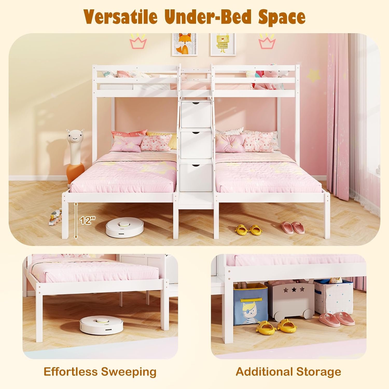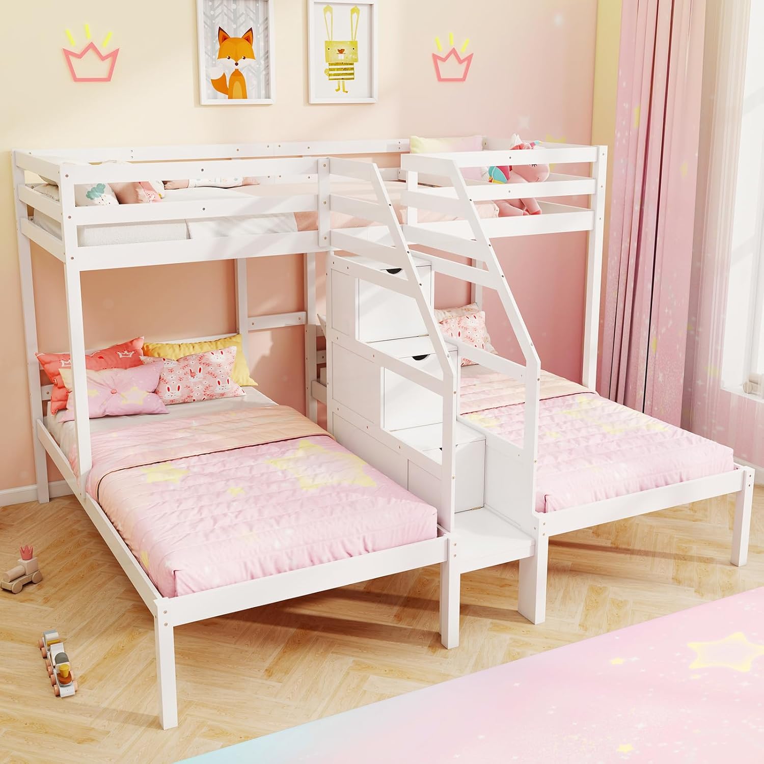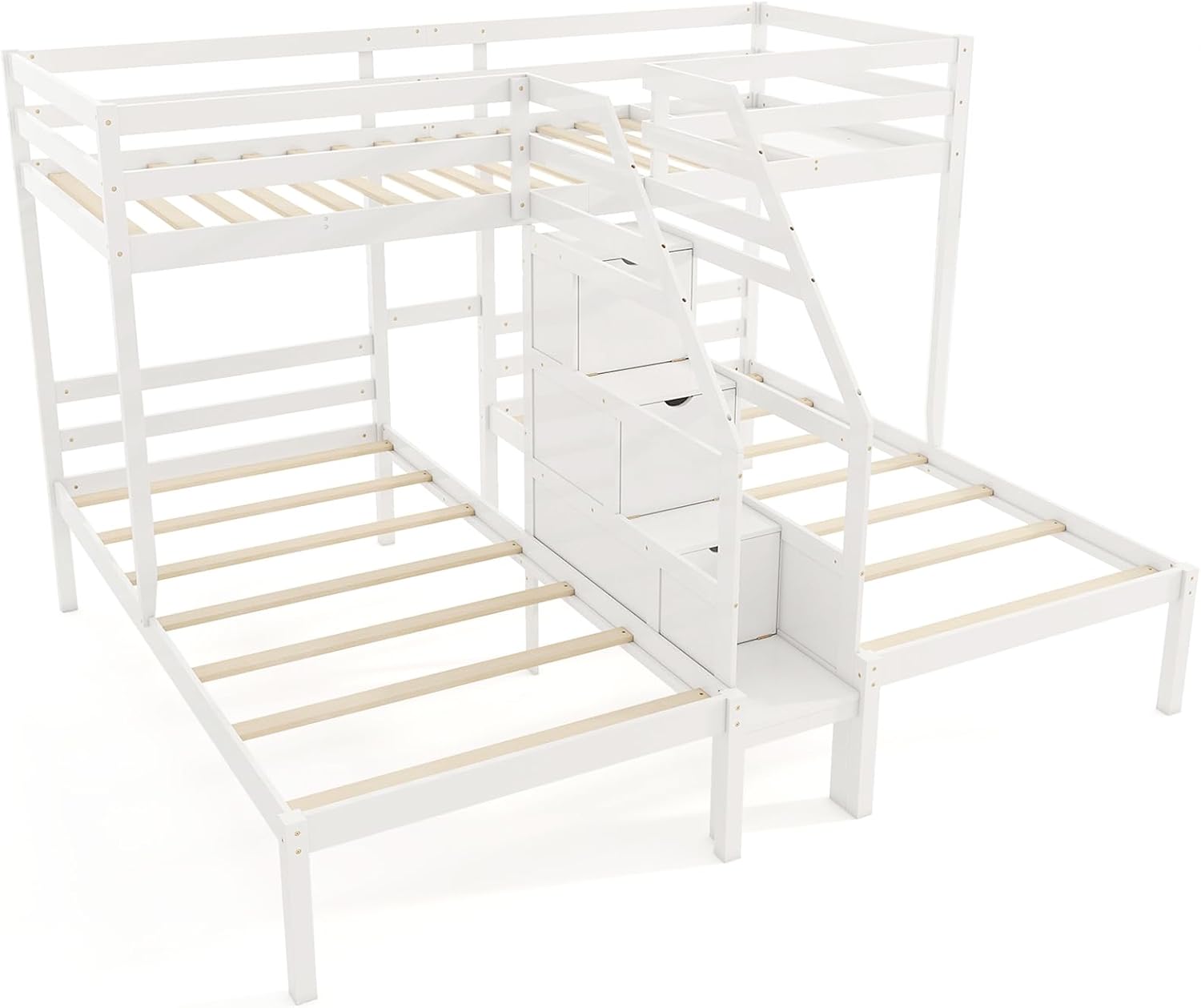 Maximize space and style with This Triple Bunk Bed with Storage Stairs. It features an upper twin bed and two lower twin beds. Safety and convenience are paramount, with a sturdy, integrated 4-step staircase that provides easy, secure access to the top bunk and includes three hidden storage compartments for toys, books, and clothes. Crafted from robust solid pine wood and reinforced with thickened slats, this durable structure ensures exceptional stability and supports up to 200 lbs per bed. Your child's safety is guaranteed with full-length guardrails, secure handrails, and compliance with ASTM/CPSIA standards. Assembly is straightforward with clear instructions. Enjoy a tidy, organized room with this practical and long-lasting bunk bed.Features:* Spacious triple bunk bed design for three children.* Built-in staircase with three hidden storage compartments.* Sturdy 4-step staircase for safer and easier access.* Durable solid pine wood structure for long-lasting use.* Reinforced plywood slats supporting up to 200 lbs for each bed.* Full-length guardrails and handrails for enhanced safety.* Complies with ASTM and CPSIA safety standards.* Easy assembly with clear instructions and labeled parts.* Under-bed clearance for convenient daily cleaning.Specifications:Color: Grey / WhiteMaterial: Pine Wood, MDF, Plywood, Engineered WoodOverall Dimensions: 97" x 79.5" x 65" (L x W x H)Size of Upper Bed Surface: 94" x 39" (L x W x H)Size of Lower Bed Surface: 75" x 39" (L x W x H)Height of Upper Guardrails: 12"Width of Upper Entrance: 13"Width of Compartments: 13"Height of Compartments: 12"Depth of Compartments: 11" / 18.5" / 26"Height of Under-bed Space: 12"Recommended Mattress Thickness: ≤ 6"Load Capacity of Each Bed: 200 lbsLoad Capacity of Each Compartment: 28 lbs / 49 lbs / 68 lbsNet Weight: 197 lbsPackage Includes:1 x Triple Bunk Bed1 x Instructions