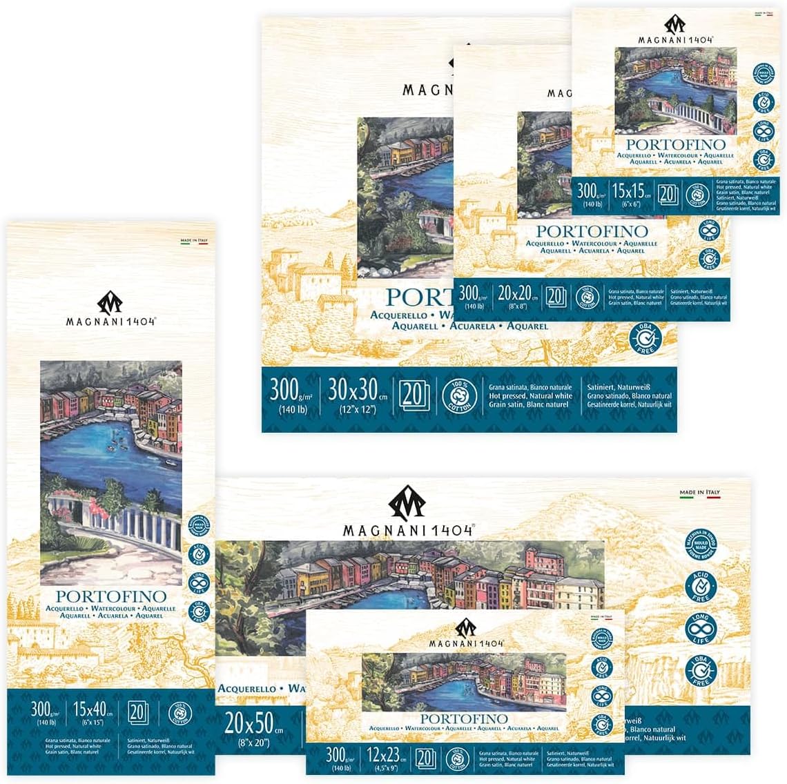Experience an exceptional painting session with the Magnani 1404 Italia Cold Press Watercolor Paper Block. This artist-grade paper is made in Italy by Magnani, a brand that has been producing papers for over 600 years. The 100% cotton, acid-free, and pH-neutral paper guarantees longevity, as it is UV resistant and can last for over a century. Its highly absorbent nature allows it to withstand multiple layers and washes, making it an ideal choice for watercolor gouache ink and fluid acrylic paint. The paper is internally and externally sized using vegan products, ensuring that it's prepared to hold up to your wet or dry media. The Magnani 1404 Italia paper is manufactured on a cylinder machine, resulting in a beautiful watermarked sheet with deckled edges that add an elegant touch to your artwork. The paper is free of optical brightening agents, and an alkaline (calcium carbonate) buffer is used to ensure the paper remains stable over time. This watercolor paper is suitable for a wide range of artists - from amateurs to professionals. Whether you're working on a watercolor 9x12 project or need a watercolor paper bulk pack for your art studio, this product is a perfect choice. It offers a versatile size for your watercolor sheets, and you can even prime it with clear acrylic gesso for use with oils. The Magnani 1404 Italia Cold Press, Hot Press, and Rough Watercolor Paper Blocks and Pads bring a new dimension to your artwork, providing you with a reliable and durable surface that respects the traditions of the art world. Whether you're a watercolor enthusiast or a professional artist, this paper will meet your artistic demands and help you achieve the best results in your watercolor painting. Enjoy the richness of colors and the convenience of this large watercolor paper sheet as you create your next masterpiece. Available in the popular styles such as 140 lb cold press watercolor paper and 9x12 watercolor paper.