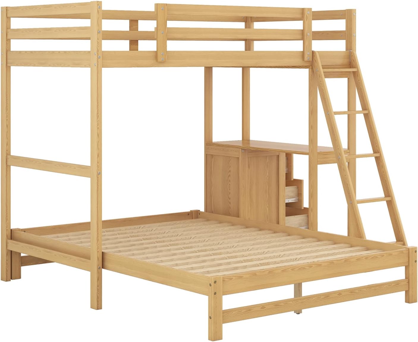 This Bellemave twin over full bunk bed anchors your room in timeless style. Crafted from solid pine wood & MDF, this twin over full bunk bed showcases slatted head & foot boards, clean-lined guard rails, & a built-in angle ladder. Utilizing every space within the bed~'s structure, a fully assembled three-drawers & built-in desk are built into the side to give you tons of storage opportunity.It can also be divided into two independent beds for even more convenience. Description Bed Material:Pine Wood+MDF Size: Twin/Full Color: Natural/ Gray Numbers of Package: 2 Assembly Required: Yes Dimensions Overall Product Dimension: 77''L77.5''W64''H Loft Bed Dimension: 75.5''x38'' Platform Bed Dimension: 75.5''x54.3'' Total Height: 64” Number of Each Bed Slats: 14/14 pcs Overall Product Weight: 180 lbs Upper/Down Bed Weight Capability: 250 /400 lb Upper/Down Bed Mattress Thickness: 6''/8-10'' Top bunk not to be used by children under 6 years of age