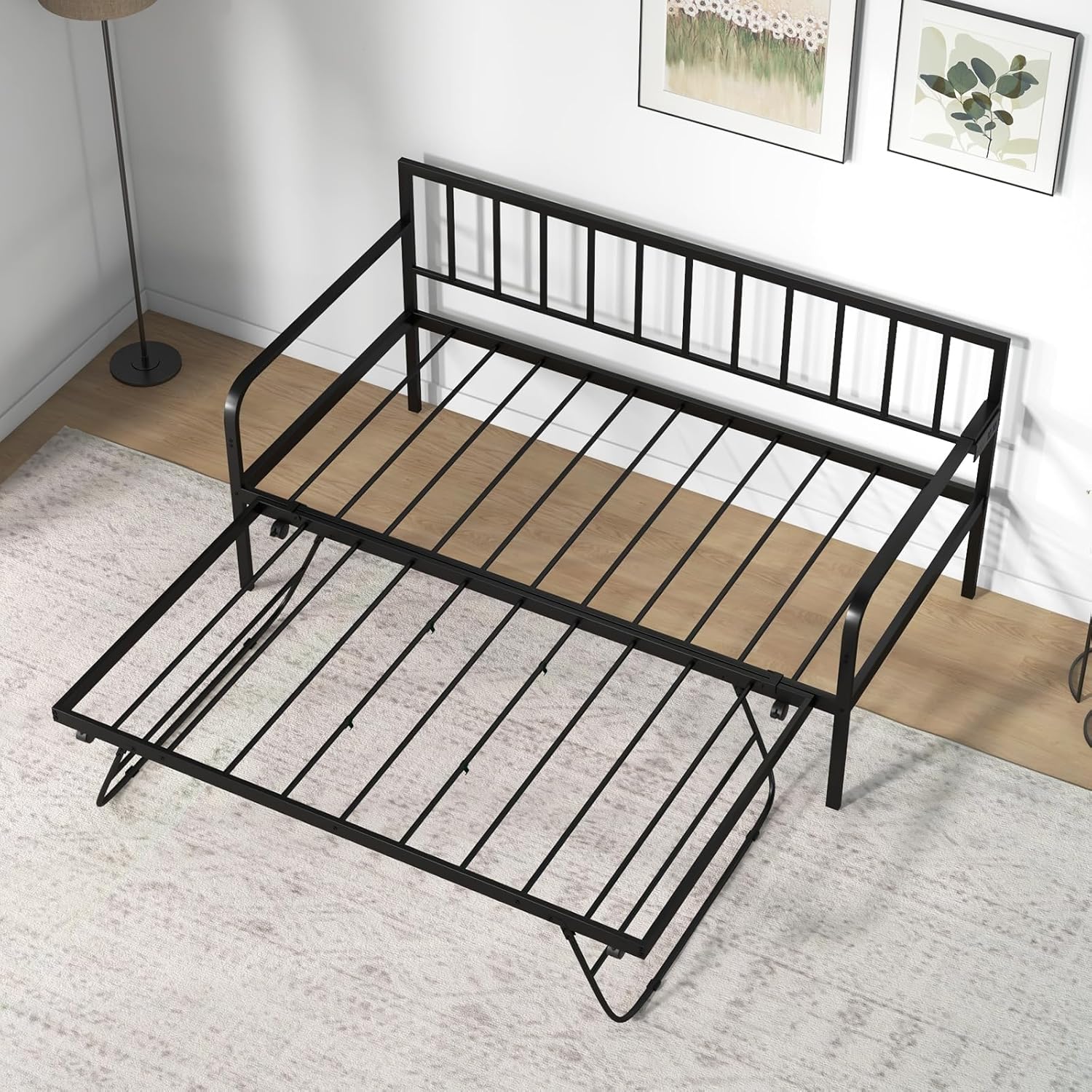 Description: This versatile daybed combines functionality with modern style to enhance any living space. Not only does it serve as a comfortable twin-size daybed during the day, but it also transforms into a spacious sleep area at night thanks to its pop-up trundle. Perfect for living rooms, bedrooms, or guest rooms, this 3-in-1 piece adapts to your needs with ease. Equipped with a built-in charging station (2 AC outlets and 2 USB ports), it keeps your devices powered and within reach. The multi-color LED light strip offers customizable lighting controlled by both remote and smart app—ideal for reading, relaxing, or setting the mood. Features: Functional twin daybed with pop-up trundle suits different needs Provides extra sleeping space for guests or sleepovers Multifunctional 3-in-1 design allows you to pull it out or let it stand Built-in power outlet with proper distance for convenient charging Multi-color LED light with various modes to choose from Speed/brightness adjustment, 1h~4h timing function for a light show Powder-coated metal slats ensure a rugged structure Stable support legs with protective pads for floor protection Curved guardrails with rounded corners for better protection 4 smooth rolling casters (2 with brakes) make it easy to pull the trundle out Specifications: Color: Black Material: Metal Overall Dimension: 78" x 40.5" x 38" (L x W x H) Dimension of Trundle: 70" x 38" x 2.5" (L x W x H) Dimension of Pop-up Trundle: 70" x 38" x 16" (L x W x H) Height Between Daybed and Trundle: 10" Clearance from Ground to Daybed: 14" Recommended Mattress Thickness: 4" –8" (not included) Net Weight: 63 lbs Weight Capacity of Sofa: 550 lbs Weight Capacity of Trundle: 330 lbs Weight Capacity of Extendable Bed: 660 lbs AC Outlet: 125V/15A USB Port: 5V/2.1A Power Cord Length: 5 FT Package Includes: 1 x Daybed with Trundle 1 x User Guide