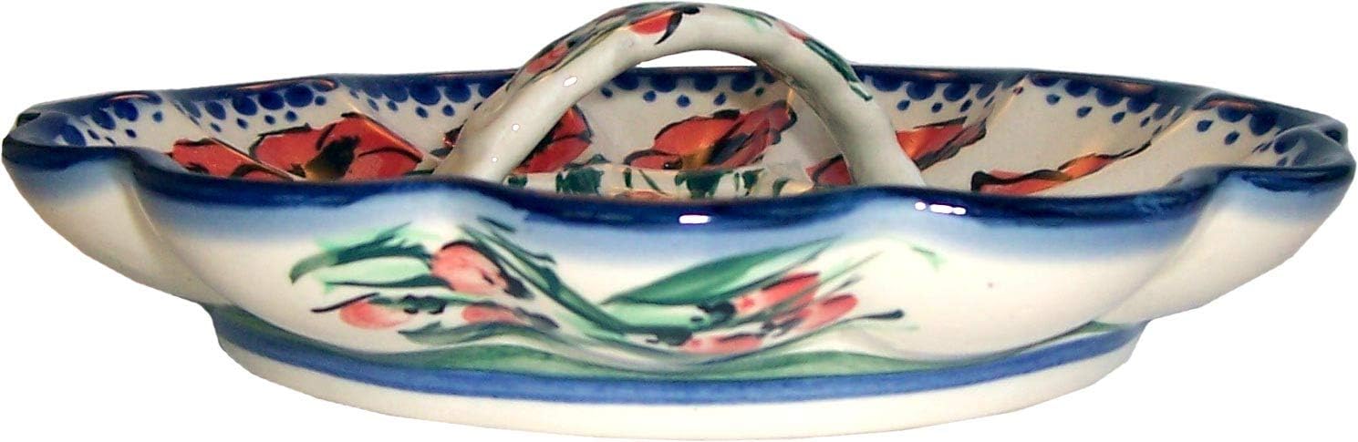 8.5'' dia and 1.5'' deep without the handle; Polish Pottery from Boleslawiec is scratch and chip resistant;lead and cadmium free; oven, microwave, dishwasher and freezer safe without losing the beautiful colors and textures. Fired at temperatures over 2,300 degrees F for long-lasting beauty.