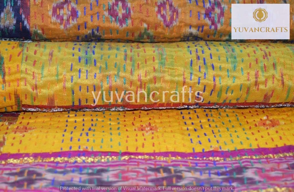 ade with 100% cotton and natural vegetable colors. This piece is of art is completely hand stitched by Women artisan in Rajasthan, India. It can make any room alive with its vivid colors, stunning Sujani print and embroidery, made using traditional and famous kantha hand embroidery method. Made from two thin layer of cotton fabric make this piece of art irresistible and also very comfortable. Adding to it's style, this kantha quilt is reversible and both sides can be used. Kantha is still the most popular form of embroidery practiced by rural women.typically use old saris and cloth and layer them with kantha stitch to make a light blanket, throw or bedspread. These cotton lightweight "Quilts" with a beautiful and colorful Paisley design can be used as