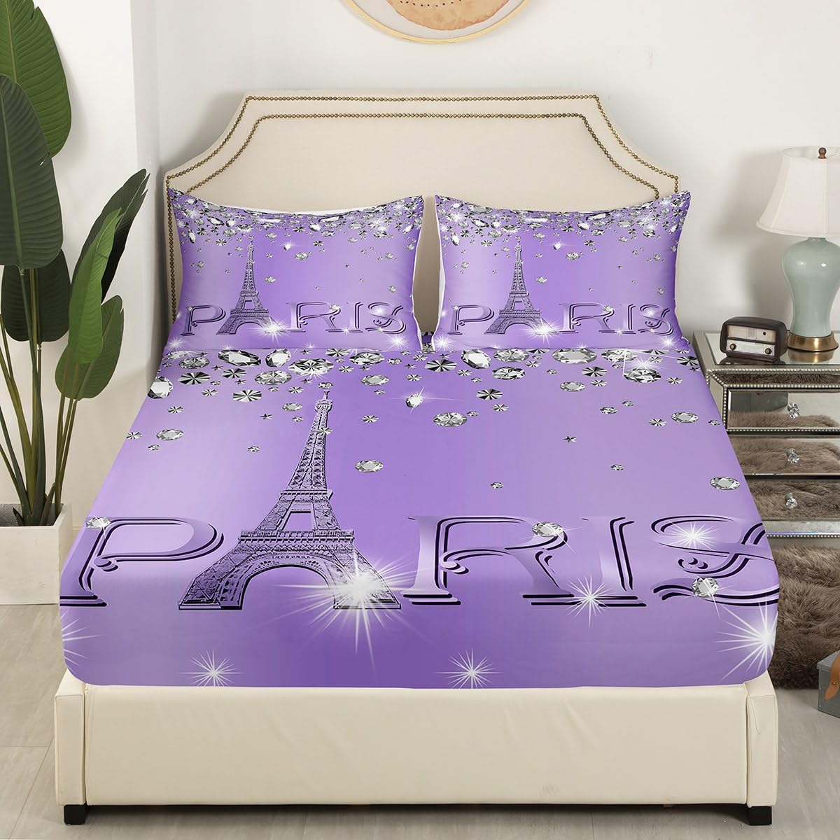 Erosebridal Eiffel Tower Fitted Sheet Full Size,Romantic Paris Tower Bed Sheets for Teens Adult,Gradient Diamond Bedding Set,Purple Sparkles Sequins Valentines Bed Cover + 2 Pillowcase,no Top Sheet
