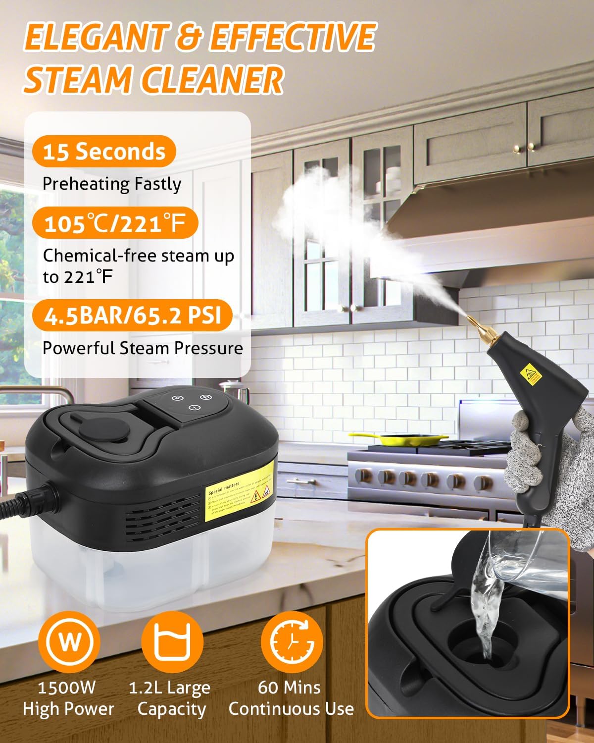 | Included Components | 6.6ft Steam Pipe x 1, 5ft Power Cord x 1, Copper Brush x 2, Nylon Brush x 2, Large Brush x 1, Glass Scaper x 1, Extension Nozzle x 1, Nozzle x 1, Scaper Cover x 2, Spare Washer x 2, Storage Bag x 1, Steam Cleaner x 1, Spary Gun x 1 |