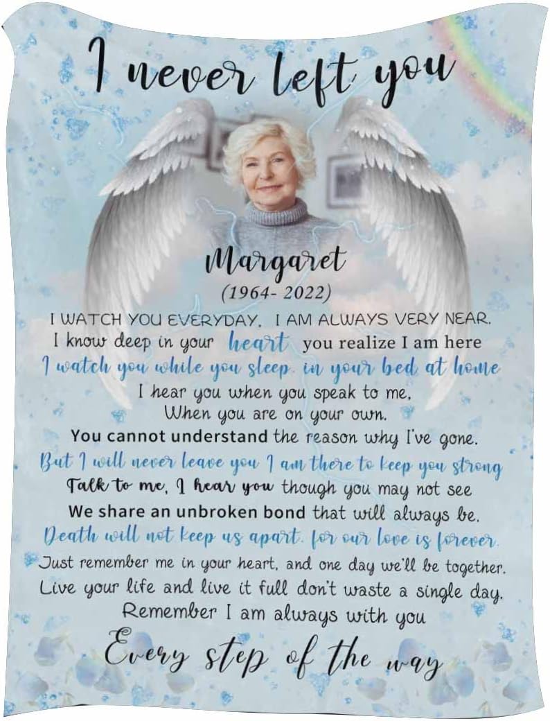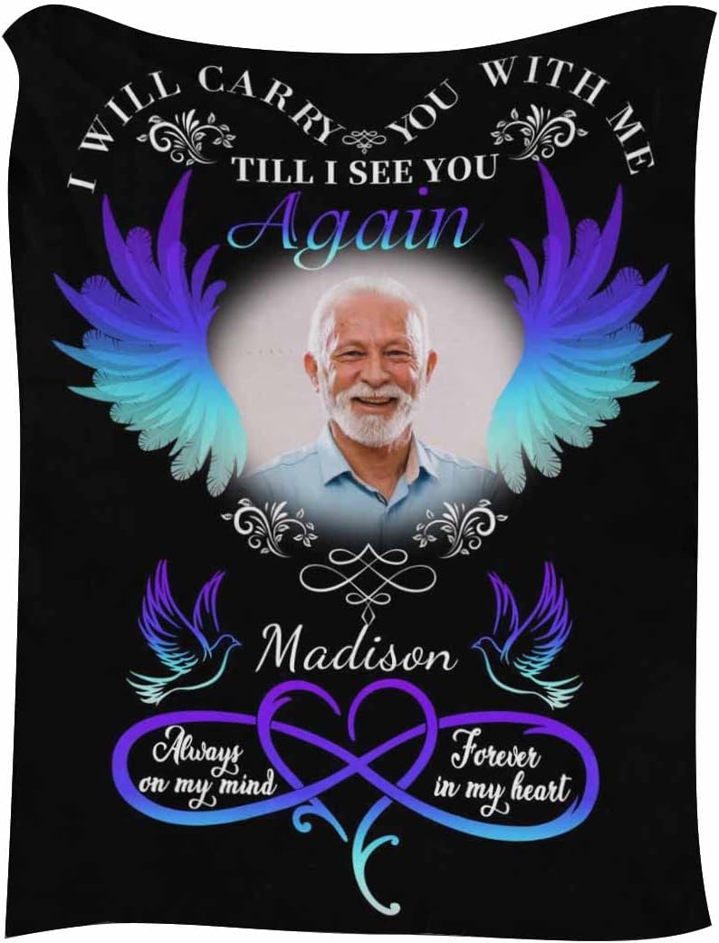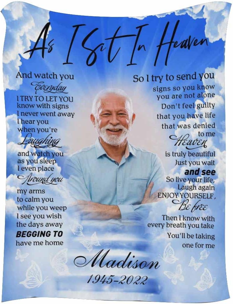 Custom remembrance throw blanket with photo is the meaningful sympathy gift for a grieving friend or family member, mom, dad, mother, father, husband, wife, son, daughter, brother, sister, grandmother, grandfather, child, dog, cat, pet. An ideal and meaningful bereavement gift for sympathy, condolence, and funeral.