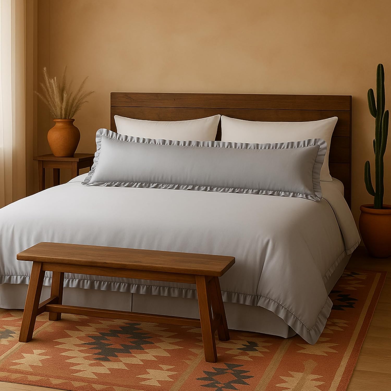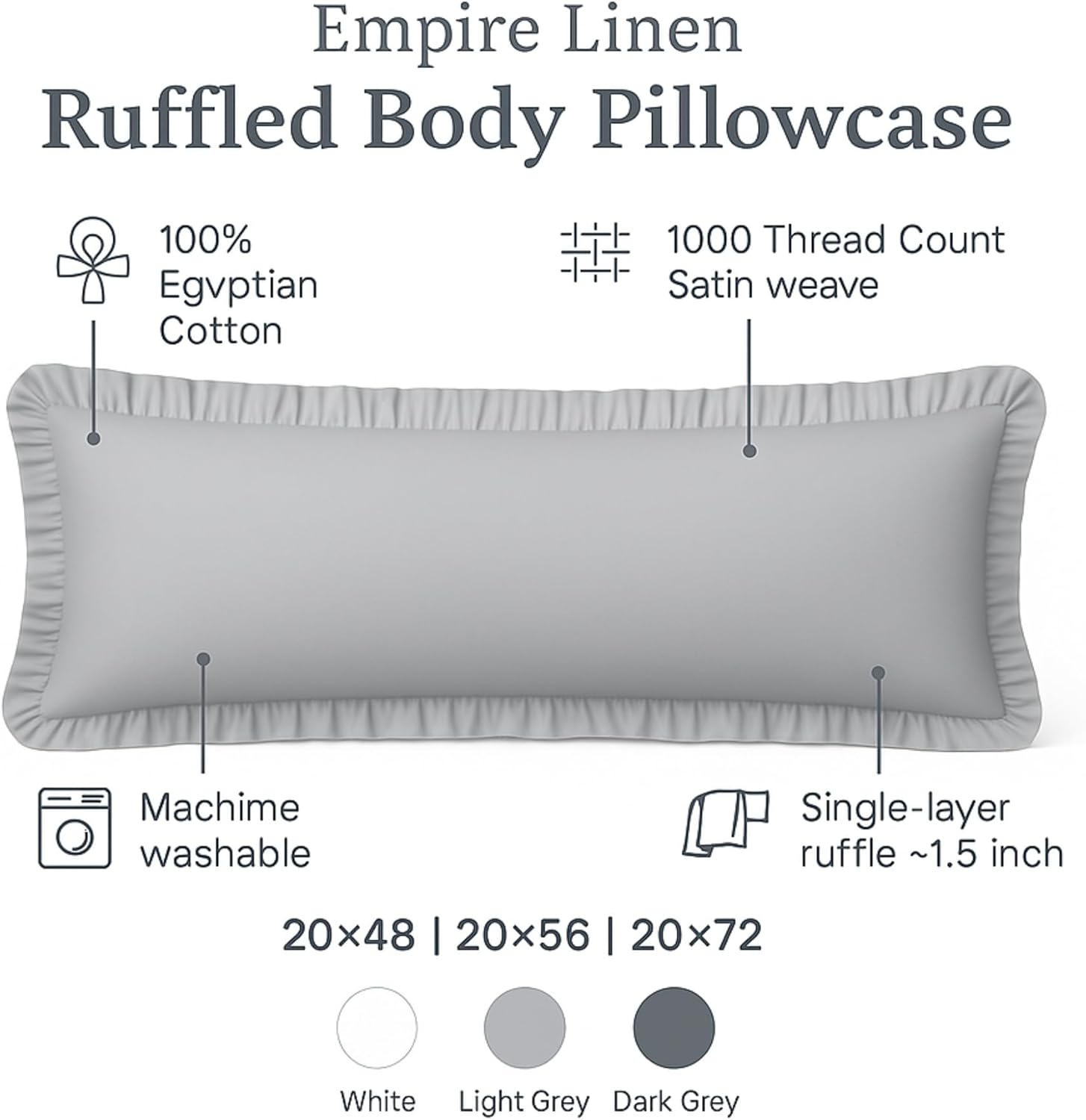 Bring a touch of elegance and comfort to your bedroom with the Empire Linen Ruffled Body Pillowcase, designed to combine decorative style with everyday functionality. Made with cotton satin weave, the fabric has a smooth and breathable texture that feels soft against the skin, creating a relaxing surface for restful sleep. The light grey tone provides a versatile color option that complements a variety of bedding styles, making it easy to refresh the look of your room. A delicate single layer ruffle runs along the edge of the cover, adding farmhouse inspired charm while blending seamlessly with both modern and traditional interiors. This timeless detail makes the pillowcase suitable for those who enjoy subtle decorative accents that elevate their bedroom décor. Measuring 20x72 inches, the cover is tailored to fit extra long body pillows, ensuring a snug and polished look. A hidden zipper closure secures the pillow inside while maintaining a smooth seamless finish, offering both practicality and a refined appearance. Beyond style, the pillowcase is designed for durability and convenience. It is machine washable and fade resistant, making it easy to maintain while retaining its softness and decorative appeal even after repeated washes. Whether used daily as a comfort accessory or as part of a carefully styled bedding setup, the Empire Linen Ruffled Body Pillowcase delivers charm, comfort, and ease of care. Add it to your home to create a cozy and stylish finishing touch that enhances both sleep quality and bedroom décor.