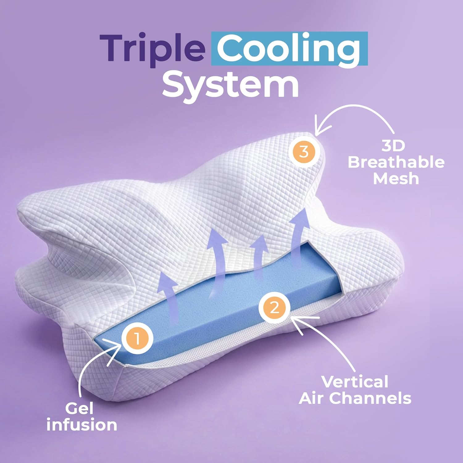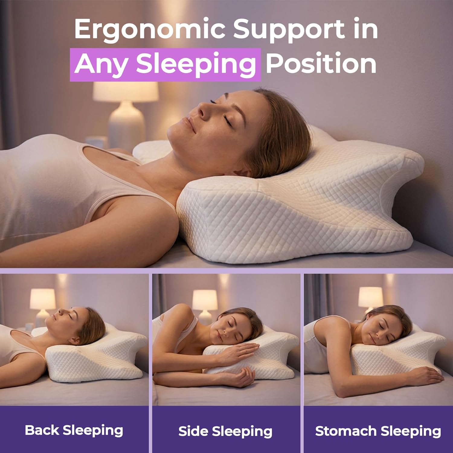 Upgrade your sleep with the FELUVI Cervical Neck Pillow. Designed with an ergonomic 4-zone contour, this cooling memory foam pillow helps support the natural curve of the neck while adapting to side, back, and stomach sleeping styles. Gel-infused foam, vertical air channels, and a breathable Tencel-blend cover work together to improve airflow for cooler overnight comfort. The slow-rebound memory foam conforms to the head, neck, and shoulders for stable support, while the removable washable cover makes everyday care simple. Made with CertiPUR-US certified foam and an OEKO-TEX certified cover, FELUVI combines breathable materials, ergonomic design, and dependable comfort in one contour pillow.