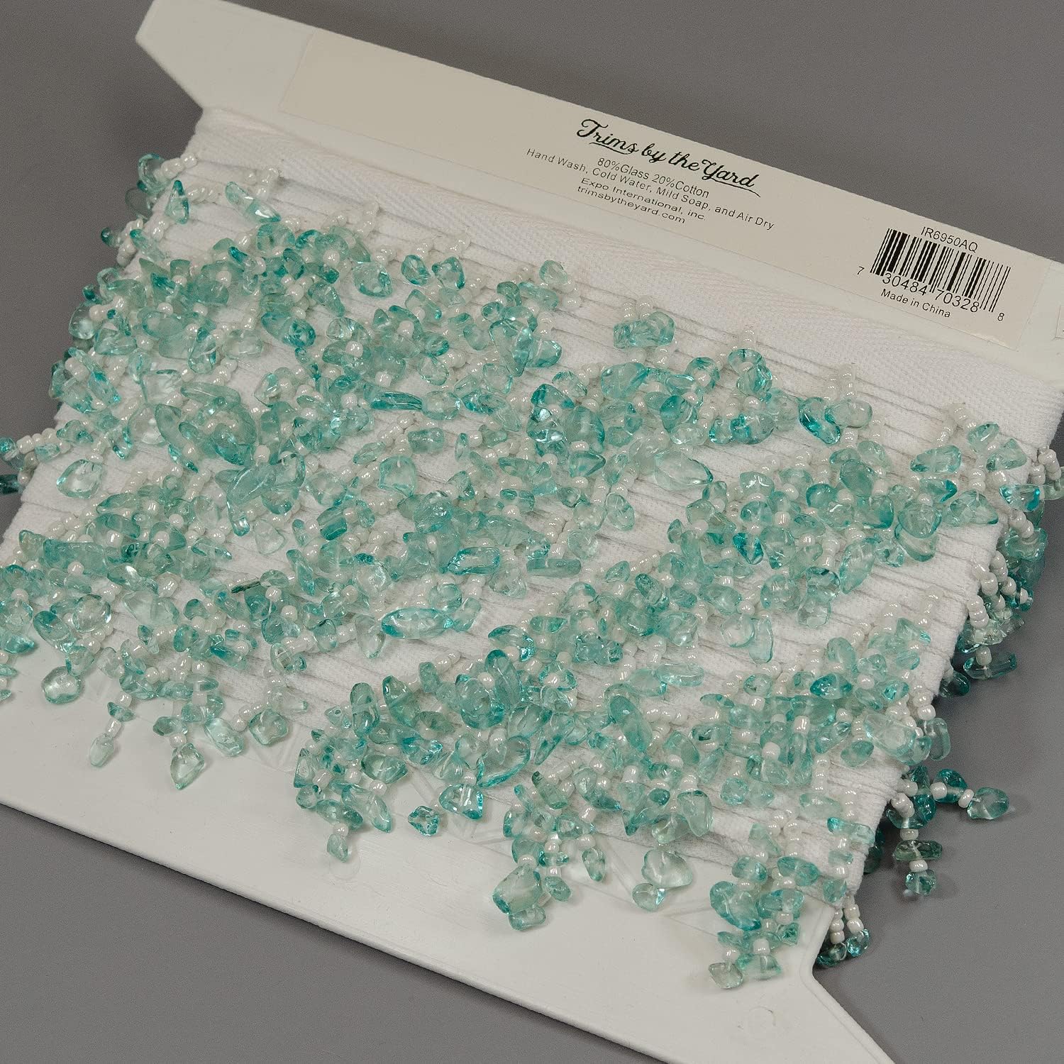 This Sea Glass Chip Bead Fringe adds the perfect natural accent to decorative accessories, table runners, drapes, costumes, curtains, lampshades, throw pillows, home decor items and bags. This is a striking trim with the sea and beach vibe making a statement in home decor. The trim is 1 1/2" in width.