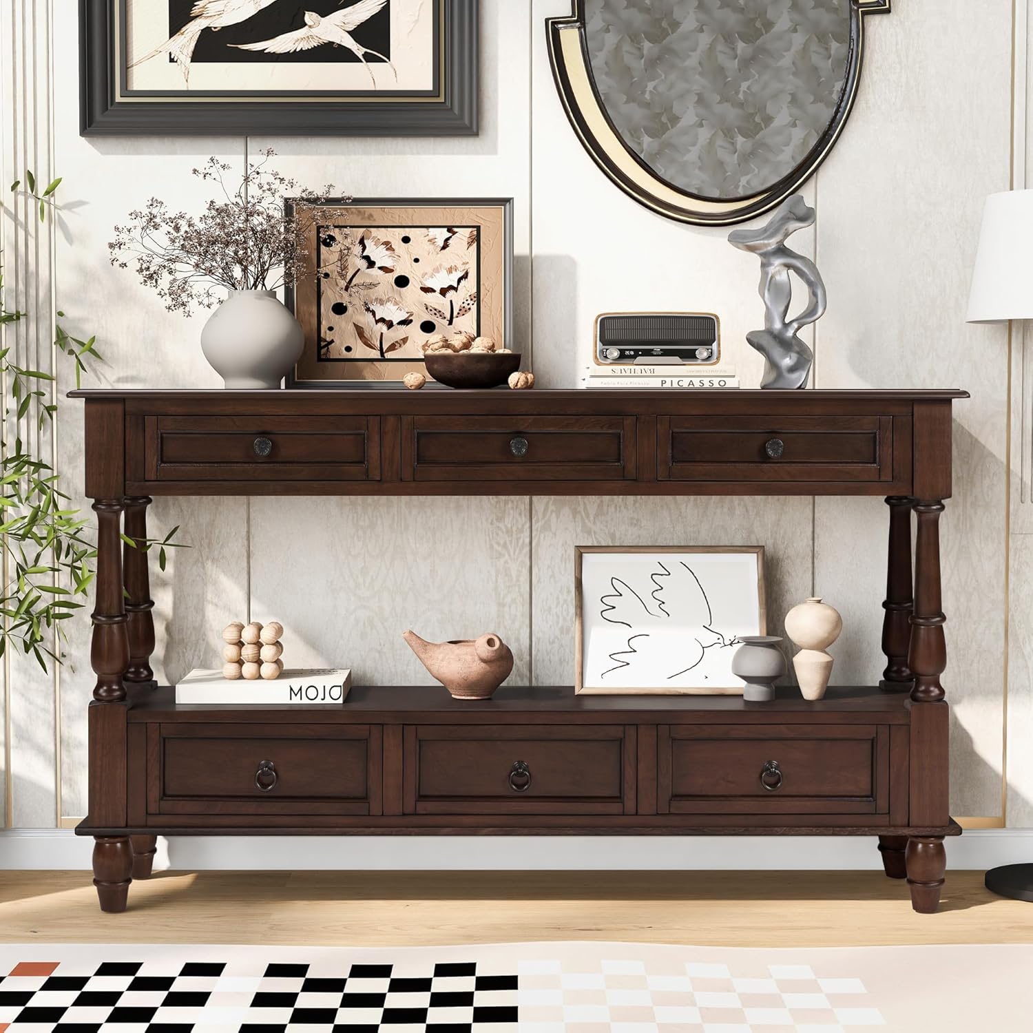 Description: Sincerely recommend this console table to you for the following reasons: Bring a retro vibe to your modern life. Solid pine and high-quality MDF material ensure the table will last longer. There are two drawers on the top and two on the bottom to keep your daily essentials organized. the spacious shelf provides a suitable place for your decorations, baskets. The four drawers are equipped with 2 different handles - retro round handle and modern hidden handle, giving you a different experience. Dimensions: Overall: 31.5" H x 36.02" W x 12.99" D Shelf: 13.34" H x 49" W x 35" D Leg Height: 3.54" Package Size/Weight: 39.76"*16.93"*22.05" / 52.91 lb Overall Product Weight: 44 lb Specifications: Main Material: Solid Wood+ MDF Wood Species: Pine Number of Shelves: 1 Number of Drawers: 4 Weight Capacity: tabletop:99 Pounds;single upper drawer:17lbs; bottom drawer:26lbs; open shelf:39lbs. Country of Origin: Viet Nam Notice: The color of the real product may be slightly different from the image due to lighting or monitor display. Manual measurements have been used and there may be some reasonable errors.