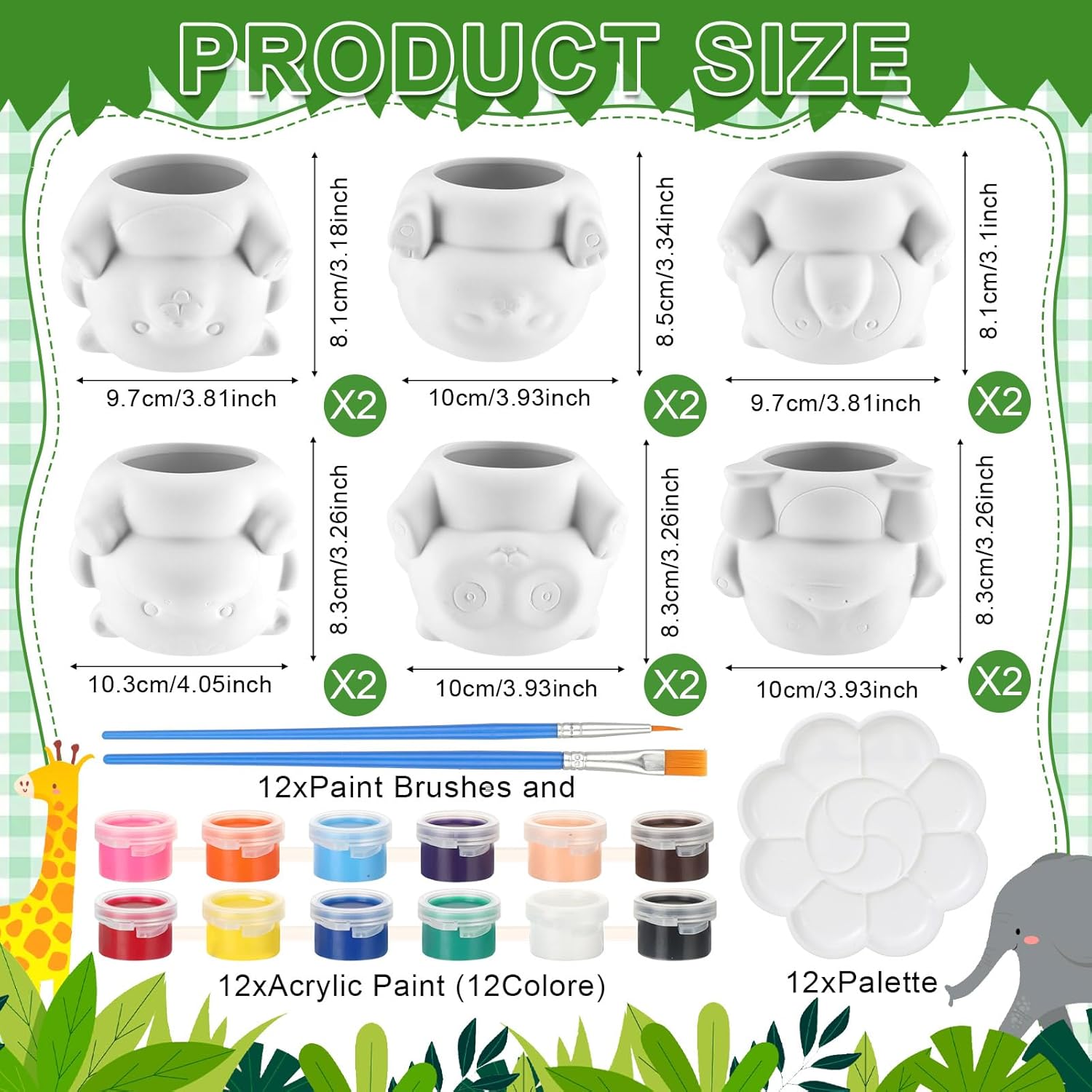 Features: Versatile crafting fun: Designed to be simple and adaptable, this planter kit invites everyone to explore their artistic side. Whether you're new to painting or seasoned in crafting, you can effortlessly create personalized designs. Unleash creativity and imagination: With a charming animal theme and insightful color mixing guidance, this planter kit encourages users to delve into their artistic potential. It provides the freedom to craft bespoke designs, feeding imagination and enhancing creativity. Specifications: Material: ceramic Color: multicolor Size: Ceramic pots: height about 3.19-3.35 inches. Width about 3.35-3.82 inches. . Top opening about 3.9 inches Package includes: 12 x Ceramic pots 12 Color paints 12 Sets of paintbrushes 12 x Paint palettes Notes: Manual measurement, please allow slight errors on size. The color may exist a slight difference due to different screen displays. Ceramic products may be damaged due to accidents during transportation. If you find any damage when unpacking, please handle the fragments carefully to avoid injury