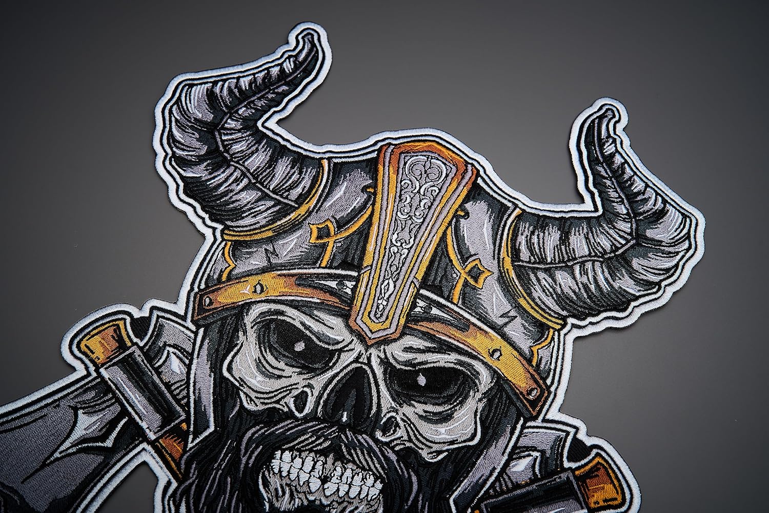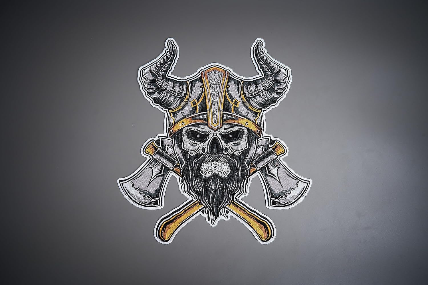 Viking Large Back Embroidered Patch for Vest.Height: 13.00 inWidth: 12.19 inAll of our patches are iron-on.All our prices are degressive, just contact us for more information.How to apply an iron-on patch : Heat up your iron. You want your iron to be on its highest heat setting in order for the patch to properly adhere to the clothing.Plan your designPlace a thin cloth over the front of the patch.Iron on patch.Flip and repeat steps 3 and 4 on backside.Let it cool, and you're done!