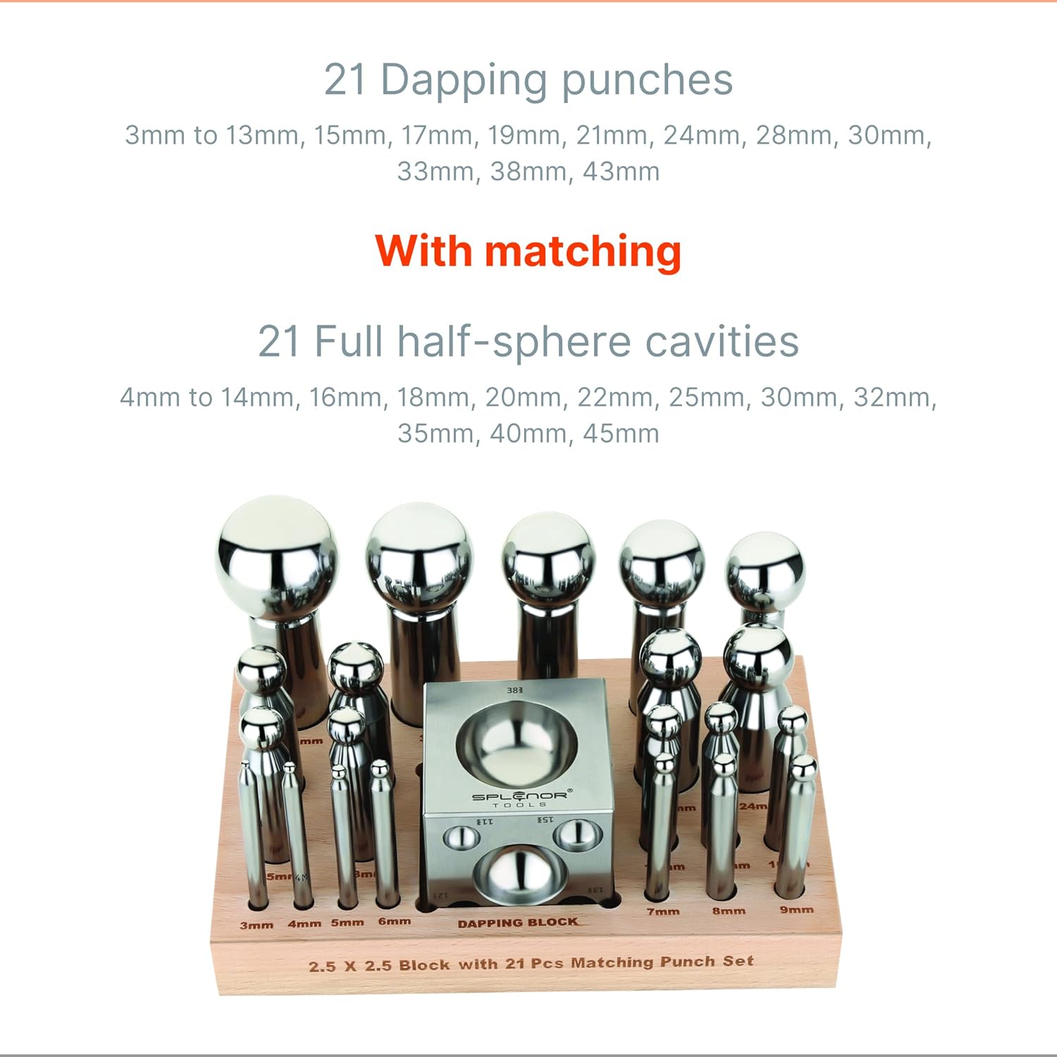 This dapping tools kit is great for jewelry making and metalworking. The smooth dapping block half-sphere cavities help to form perfect dome shapes without leaving any machining mark on metal. The thick chamfer of doming block edges makes it more comfortable to hold. This dapping kit is ideal for professional jewelers as well as for beginners & hobbyist use.