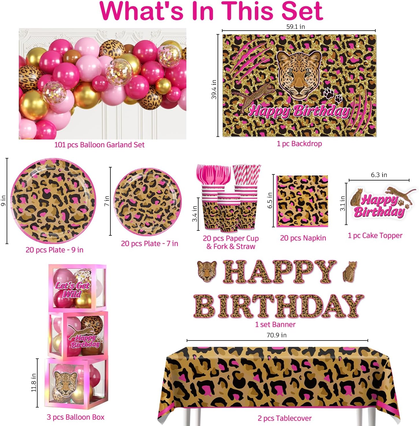 | Included Components | cheetah print birthday decorations banner, balloon arch, cake toppper, holographic material balloon box, cupcake toppers, leopard print birthday decorations plates(7"&9") and napkins, forks, straws, napkins, cups |