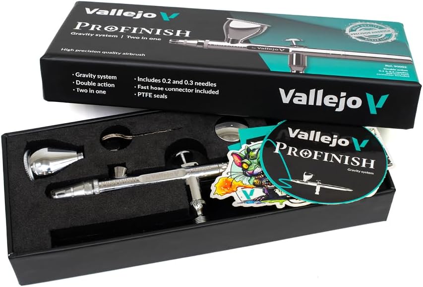 Profinish airbrush features a sleek chrome design and an innovative needle travel regulator and paint control. It includes an independent double-action function using a gravity system that is very intuitive to use. It has a floating nozzle, which is easy to disassemble and clean. It includes a 0.2 and 0.3 mm needle/nozzle set, three screw-on cups (0.1 - 0.3 & 0.5 fl.oz.), and a quick-connect hose fitting.