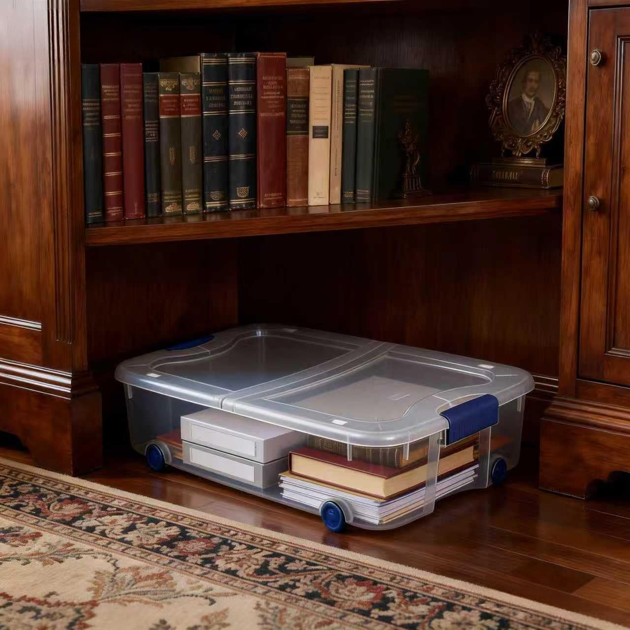 66 Quart Clear Wheeled Latching Storage Bin and get organized! Easily view contents from any angle through the clear lid and base, while latches keep lid in place. Gliding wheels provide mobility to easily slide bin underneath a bed to maximize storage space. The unique center-hinged lid provides easy access without fully removing it or pulling the entire bin out. An ideal storage solution for wrapping paper, bedding, linens, shoes and more, keeping items close at hand but out of sight. Take advantage of unused storage space to help bring order to bedrooms and closets!