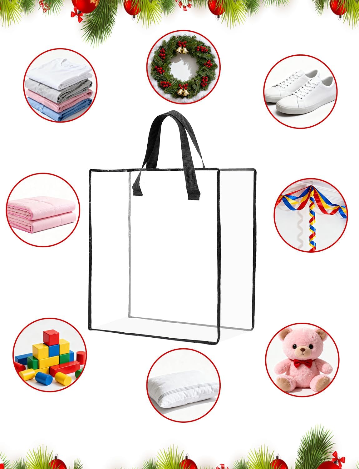 Features: HFKPJRT 10 Pack Wreath Storage Bag, 26" 90 L Garland Container, Wreath Bags for Halloween Christmas Decorations, Large Clear Moving Bags With handle, Under the Bed Storage for Bedding, Clothing, Toys Specifications: Material: Plastic Color: Clear Style: Square wreath storage bag Size: 26" Package includes: Stoarge Bag x 10 Pcs Notes: Manual measurement, please allow slight errors on size. The color may exist a slight difference due to different screen displays.