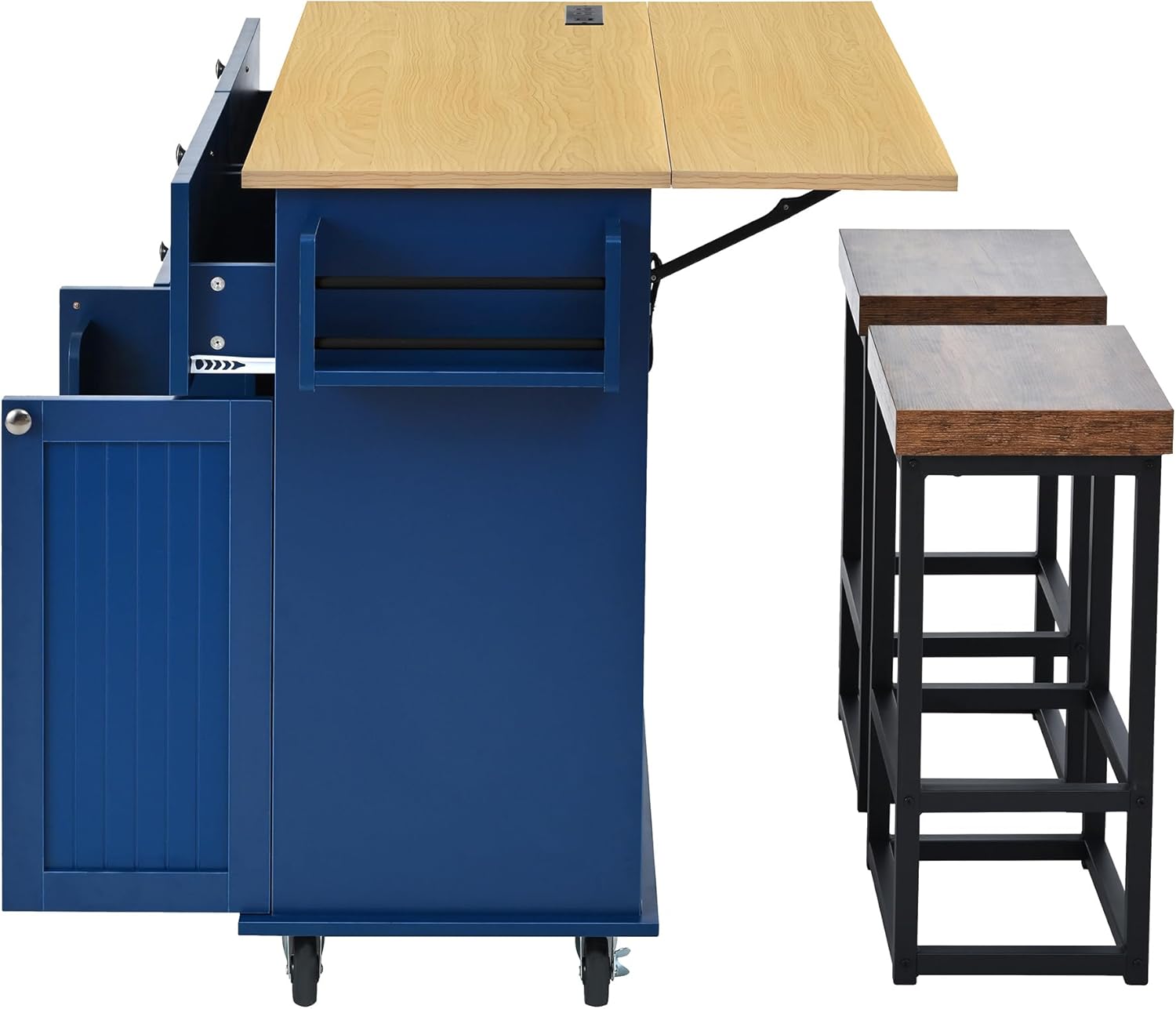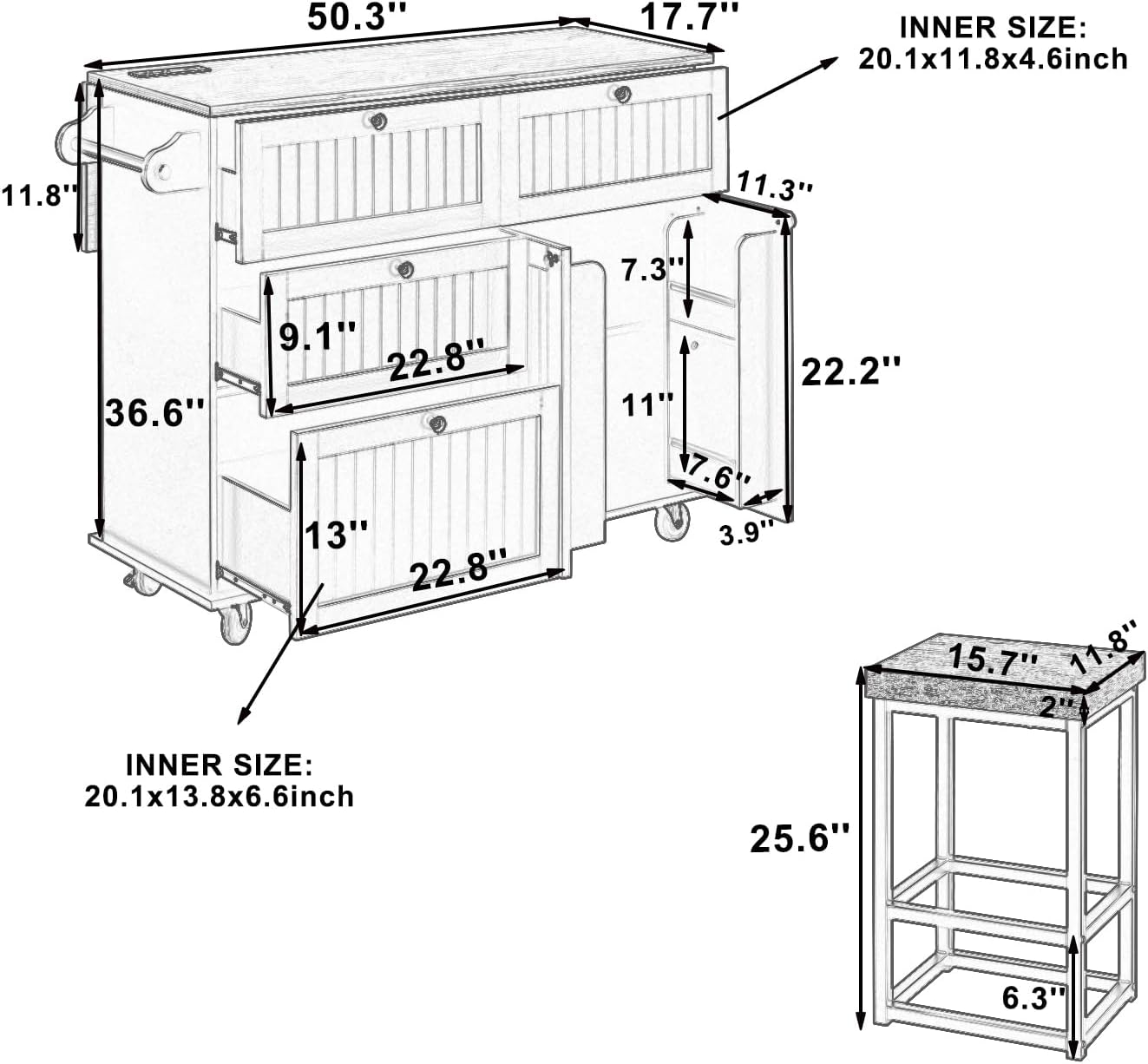 | Material Type | Island top/ legs: rubber wood; Island Body: MDF; Stool: MDF Board+Iron Frame |