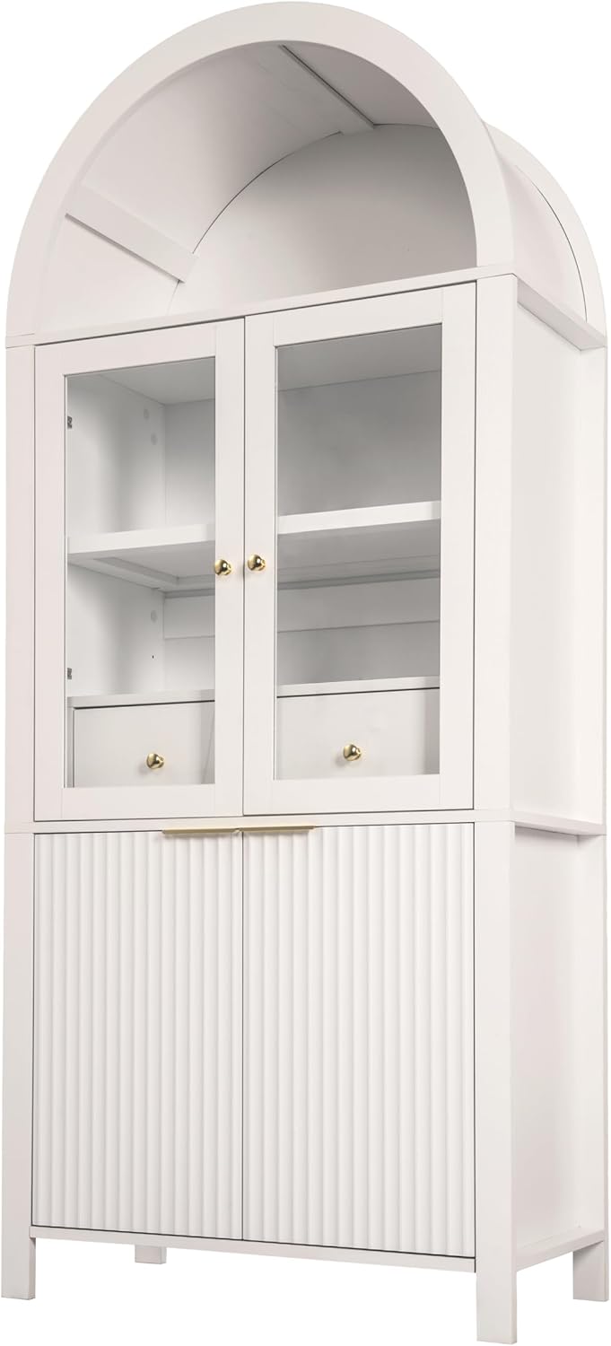 Bring elegance and versatility to your home with this 71" Fluted Tall Arched Pantry Cabinet. Featuring refined vertical fluting, transparent tempered glass doors, and a hidden drawer, this modern cabinet elevates any space while keeping your essentials beautifully organized. Product Dimensions: Overall: 31.5"L × 15.75"W × 70.87"H Drawer: 24"L × 11.8"W × 3.7"H Product Weight: 112.2 lbs Package Size: 37.01"L × 19.49"W × 14.57"H Package Weight: 123.2 lbs Flexible Storage for Every Room: With two adjustable shelves and built-in racks, you can easily customize the interior layout to store a variety of items—from cookware and dinnerware to books, office files, or bath towels. Sturdy & Thoughtful Details: Made of premium MDF with a painted finish for long-lasting durability, the cabinet features metal handles and tempered glass panels for strength and sophistication. Anti-tip kits ensure safety for households with children or pets. User-Friendly Design: Adjustable leveling feet allow stability even on uneven floors, while the middle support foot enhances balance and load capacity. The elegant glass doors keep dust away while showcasing your favorite decor. Whether you use it as a kitchen pantry, dining buffet, bathroom storage, or living room display cabinet, this fluted tall arched pantry offers the perfect balance of modern design, ample storage, and refined craftsmanship.