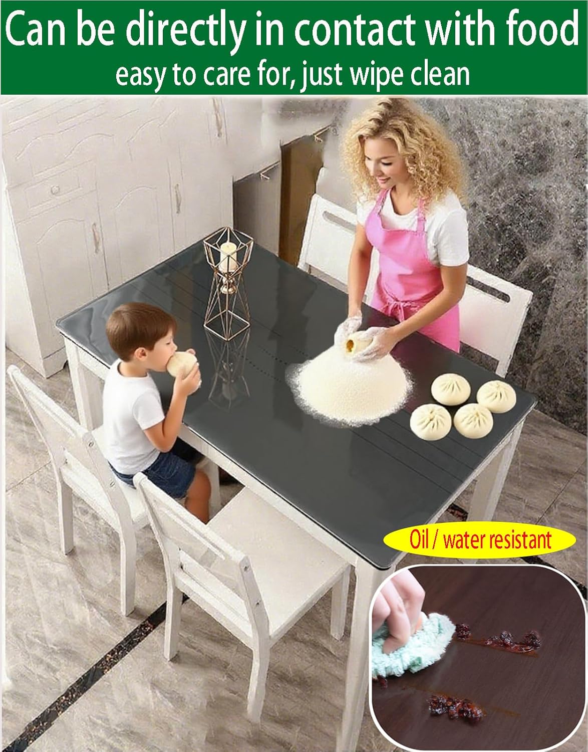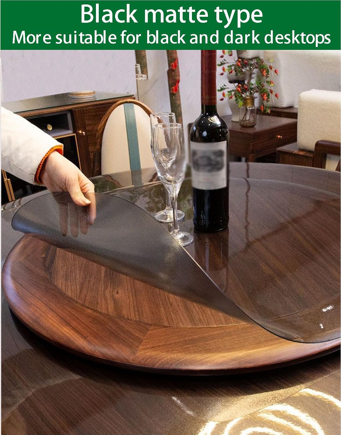 Product DescriptionSuitable for Black colors desktopName: Black Clear table matCraftsmanship:Single-Sided matteDining table: Heat-resistant, bubble-freeSuitable for: Suitable for black surfacesOffice desk: Crystal clear, easy mouse trackingCraft table: Fade-resistant coating prevents markings,0.5cm rounded corners, polished edge designScratch-resistant surface - Withstands scratches from chef's knives and craft toolsWater-resistant design - Protects against spills from wine, coffee, and oilNon-slip base - This PVC tablecloth protector adheres securely to tabletops and floors, providing excellent non-slip performance.Product Listings:Table mat *1Roll-packed deliveryNotes: 1. Since this product is shipped in a roll, some creases or curling may occur upon receipt. These will return to their original after use.2. Due to manual measurement, there may be slight variations. Please refer to the actual product for accuracy.3. Due to the long-term transportation and sealed environment, some odors may develop, but these will dissipate after a few days.4. Since the table mat is soft material, it may heat unevenly and occasionally leave some marks. This is normal. these marks will fade as the surface softens.Why choose this custom clear desk protector?Precise Custom SizesMeasure your table and submit your custom measurements for a perfectly tailored cover.Perfect for: irregularly shaped dining table covers, mid-century modern dresser mats, computer desk covers, writing desk mats, kitchen countertops, drafting table covers, RV table runners, chair rugs, and hard floor protectors to protect your expensive furniture from damage.