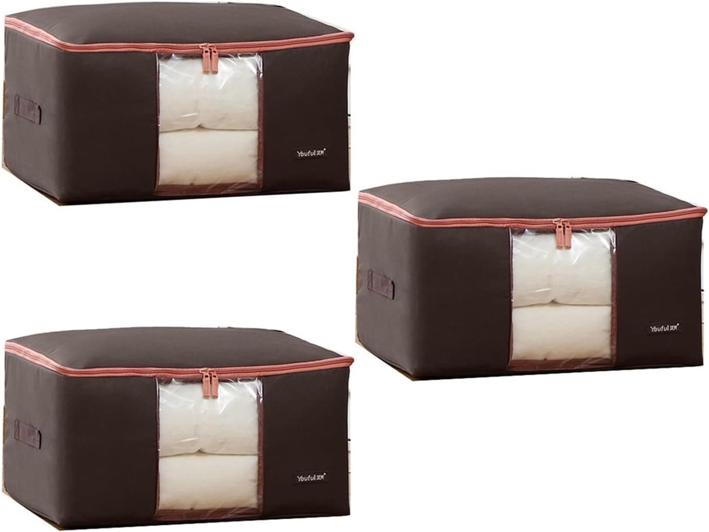 We committed to produce products that are closest to people's needs and best show the beauty of space, and life happiness.Save Space: Make more space at home for daily storage.Keep Neat: Solve storage trouble and keep organized to make live better.Stay Organized: Make organization a part of your life. Organize your space and live better.Multipurpose: Our products are designed to be used in multiple scenarios and situations.Serve: We are committed to offer the best quality products and giving customers the most satisfactory service.【PRODUCT PARAMETERS】Material: oxford clothSpecial Feature: Durable,See-throughClosure Type: ZipperItem Package Quantity: 3Product Dimensions: 50L: 19.7x15.7x9.8in(50*40*25cm) , 72L: 23.6x15.7x11.8in(60*40*30cm) , 100L: 27.6x16.5x13.8in(70*42*35cm)[1cm=0.394inch] Due to the different measurement tools have 1-2cm error is a normal.【PRODUCT DETAILS】Reinforced HandleThe handle of the large storage bag is sewn with thick cloth, which is not only firm, but also protects hands.Sturdy ZipperEquipped with durable zippers which are hard to break, and can be used for a long time.Clear WindowThe dedicated clear window in the front allows you to see what is stored inside the totes for storage quickly.Foldable DesignWhile not in use, you can fold the storage bags away, and put them into a drawer or closet to save space.Saving Space effectivelyThe clothes storage is not only for organizing your clothes, quilts or blankets, but also saving your room space, especially keeping the off-season clothes and quilts in their place.【AFTER-SALES SERVICE】We are very grateful for your support of our products, and we are committed to providing customers with better service. If you are not satisfied with anything, please do not hesitate to contact us. We will do our best to solve your probl