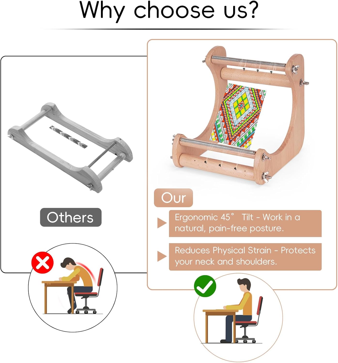 • Ergonomic Design --- 6" x6.7"work surface, supporting up to 86 warp threads.The 45-degree angled desktop design reduces physical strain and protects your neck and shoulders, allowing you to work on your crafts in comfort.