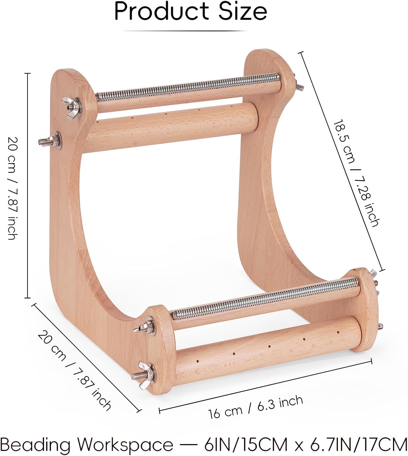 Ergonomic Design --- 6" x6.7"work surface, supporting up to 86 warp threads.The 45-degree angled desktop design reduces physical strain and protects your neck and shoulders, allowing you to work on your crafts in comfort.Bead Loom Kit --- Bead Loom,20g-3mm Beads,5×Needles,120M-0.15mm Beading Wire,Bead Scoop,Flocking Bead Mat and Bag,Scissors,8×Lobster Clasps,8×Open Jump Rings,10×Clasp Tubes,Instruction Manual.Unlimited Beadwork Length --- This all-new bead loom differs from previous versions with its detachable and extendable base, allowing for unlimited beading length. Crafted from solid wood for lasting durability, it is easy to operate and perfectly suited for beginners and adults alike to create beautiful jewelry.Easy to Start --- Designed for absolute beginners—no complex threading or prior experience needed. Our 45° angled work surface lets you create from the very first bead in a comfortable, natural posture. It makes bead weaving a truly relaxing and effortless hobby, perfect for newcomers and all craft lovers.A Therapeutic Crafting Experience --- More than just an alternative to screen time, it offers a therapeutic escape. Find stress relief and improved focus through the rhythmic motion of beading, and experience a true sense of accomplishment and joy upon completing your own beautiful, one-of-a-kind piece.