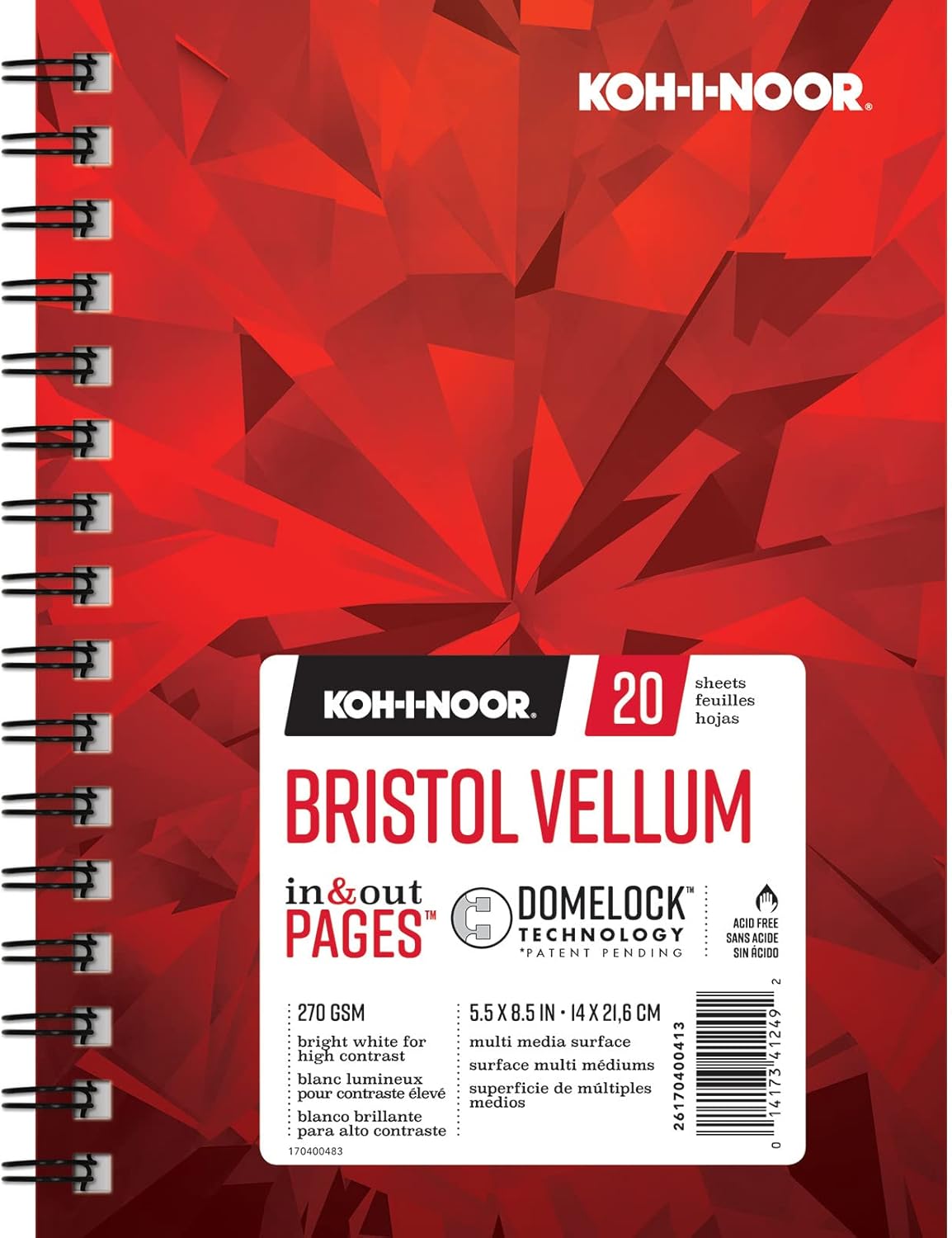 Koh-I-Noor Bristol vellum bright White paper pad with "in & out pages" is traditional 270 gsm Bristol vellum paper with a bright White surface for high contrast artwork. Bristol pad is dual loop wire-bound construction and features “in & out” pages (patent pending) that allow you to remove sheets from the pad for drawing, reworking, scanning, and more. Upon completion, simply Return the sheets into any other Koh-I-Noor or Grumbacher wire-bound pad. Made in USA. 270 gsm, 19 x 24 inches, side wire-bound, 20 sheets per pad.