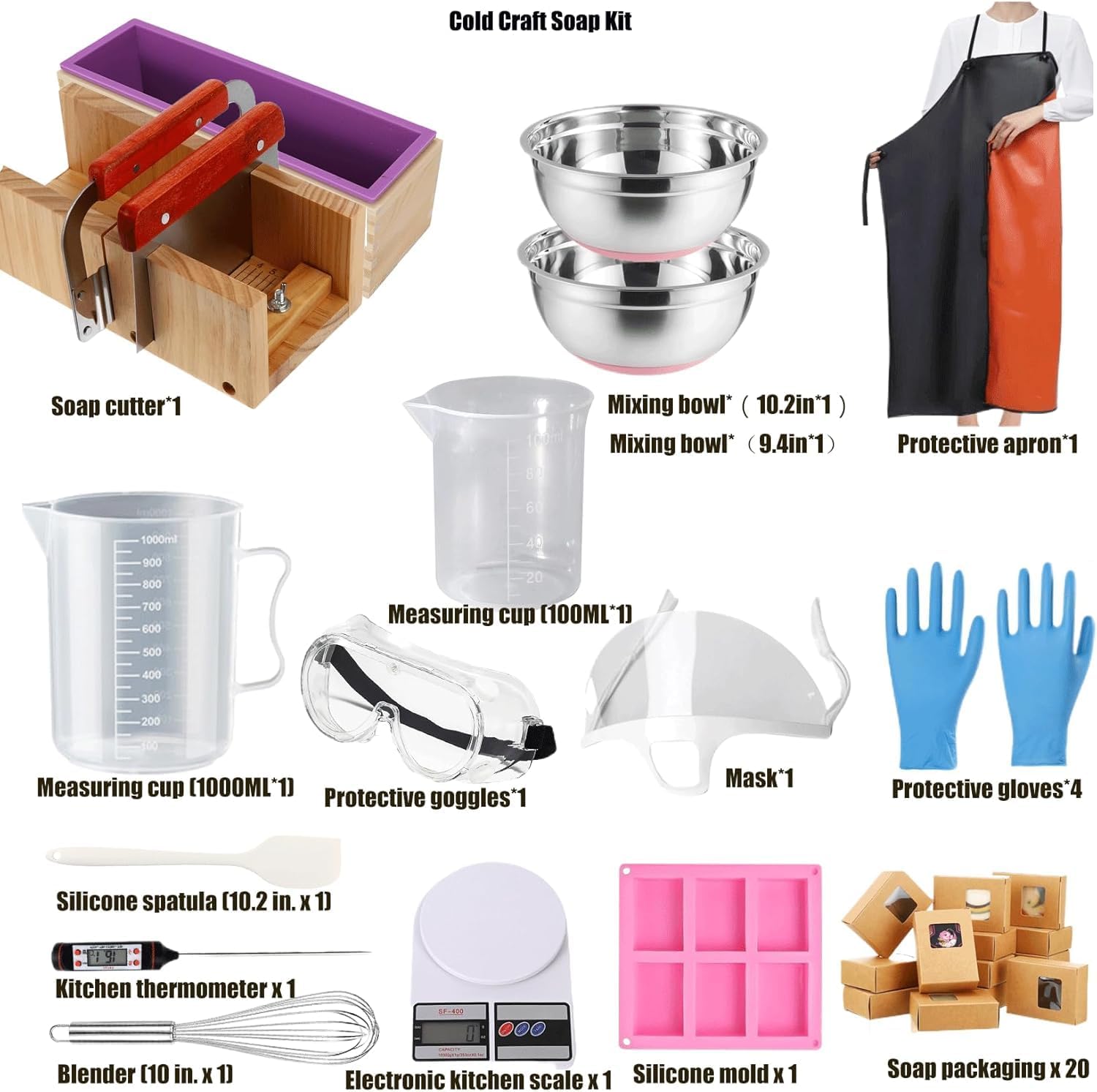 | Included Components | printed instruction manual, gloves, mask, apron, goggles, soap cutter, soap mold, mixing measuring cup x2, digital scale, stirring stick, thermometer, spatula, mixing bowl x2, soap packaging box x20 |