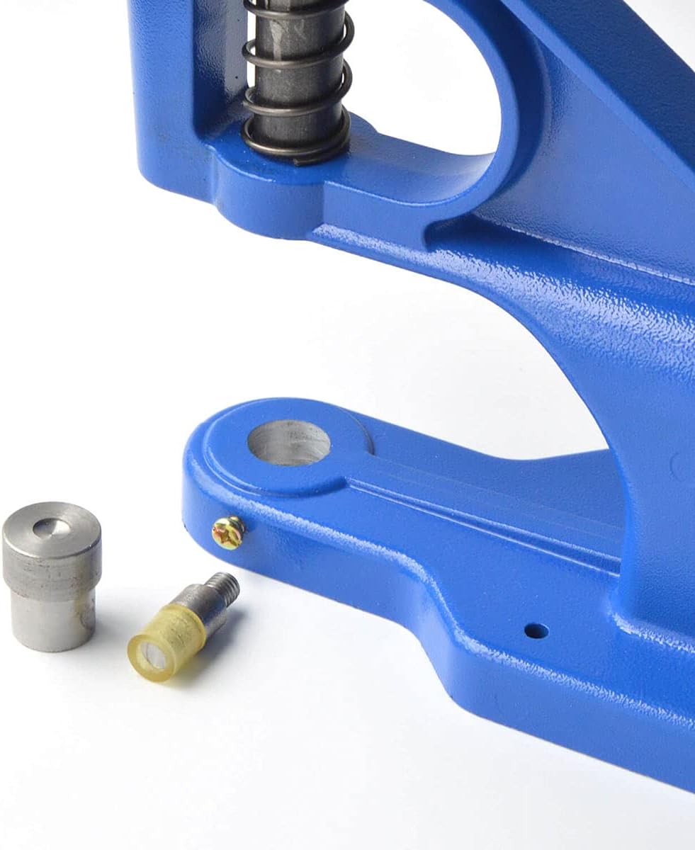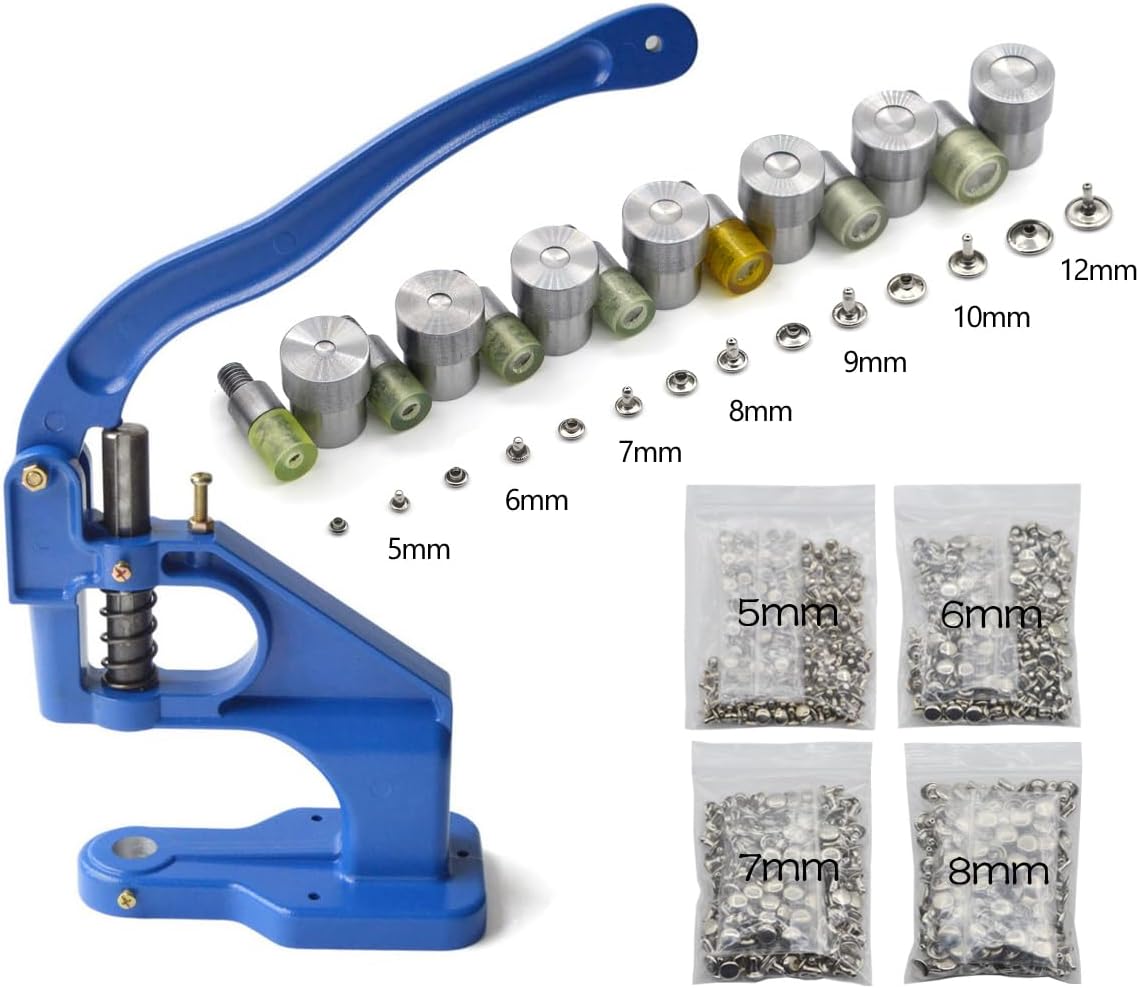Package include: 1PC Blue Machine; 7Sets double cap rivets mould the size is 5 mm 6 mm 7mm 8 mm 9 mm 10 mm 12 mm; 400 sets double cap rivets the size is 5 mm 7 mm 6 mm 8 mm, Each size 100sets silver color and brass material