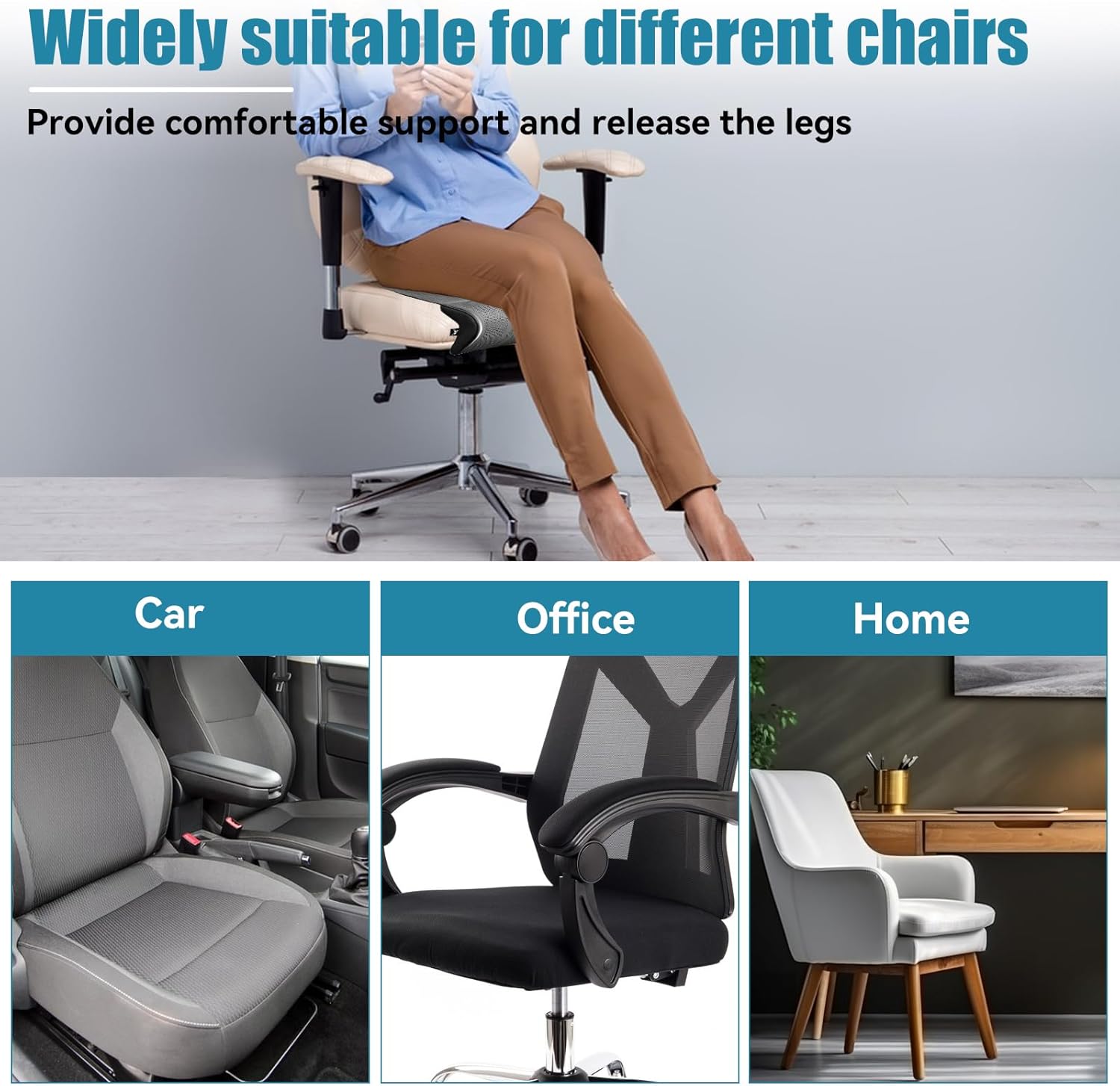 Package Includes: 1 x Car Seat Leg Extender Cushion (Black) Material: Top & Sides: Premium genuine leather-look PU leather – Durable, scratch-resistant, and easy to clean Core:High-density memory foam – Provides firm yet soft support that contours to the shape of your legs Bottom:Non-slip silicone grip pattern – Prevents shifting during driving or movement Fabric Backing:Breathable mesh with perforated design – Enhances airflow and reduces heat buildup for all-day comfort Color:Black Dimensions: Length: Approx. 18 inches (45 cm) – Extends seat depth for longer legs Width: Approx. 16 inches (40 cm) – Fits most driver and passenger seats Height/Thickness: 3.5 inches (9 cm) – Optimal lift and support without overextension Adjustable Fit: Universal design stretches and conforms to fit various seat sizes and angles Features: Ergonomic Memory Foam Support – Relieves pressure on knees, lower back, and thighs during long drives Universal Compatibility – Fits cars, SUVs, trucks, buses, trains, office chairs, sofas, and airplane seats Breathable Perforated Leather – Airflow channels prevent sweating and overheating, ideal for all seasons Anti-Slip Silicone Base – Stays securely in place even during sharp turns or sudden stops Tool-Free Installation – No assembly required; simply place on seat and adjust for comfort Multi-Scenario Use – Perfect for tall drivers, elderly users, or anyone needing extra leg support