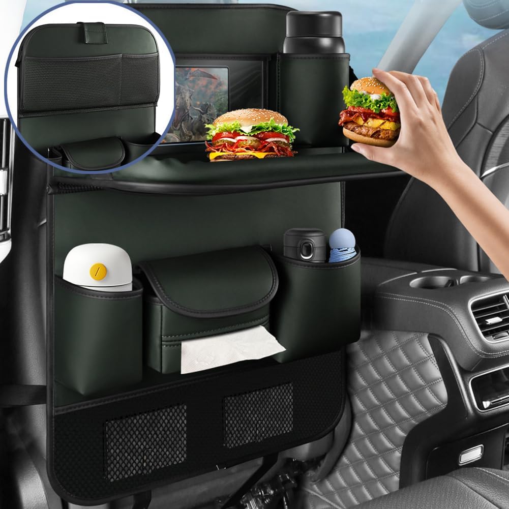 WHY DO YOU NEED A CAR BACKSEAT ORGANIZER? 1. Car seat back organizer provides an extra storage space for your car, can store many items,such as tablets, cell phones, handbags, water glasses, tissues, magazines, snacks, toys etc. Keep your car clean and organized! 2. The design of the foldable dining table is convenient for you and your child in the back seat to eat or place a tablet computer. Children can enjoy eating retail or watching TV on the road without getting bored. Specification: Materia: PU Leather Size: 25.2* 17.7* 9 inches Color: Black / Gray / Brown / Green Package Included: 1 x Car Backseat Organizer with Tablet Holder