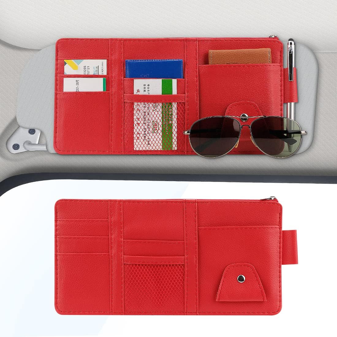 ORGANIZE YOUR SURROUNDINGS AND SIMPLIFY YOUR LIFE!Are you tired of digging in the glove box to find your license, registration and insurance information?Looking for something to hold your pens, mini notebook, receipts, or any other small routine travel item? THE MOST EFFICIENT CAR DOCUMENT ORGANIZER ON AMAZON.A simple and minimalist design, with multiple pockets and pen holders, makes this car visor organizer perfect for keeping your small and vital driver essentials close and instantly accessible when needed. Tight pockets to ensure nothing falls out whether the visor is up or down.Sturdy cardboard backing to fit flat against car visor.Convenient for everyday use.Waterproof, easy to clean, and completely odorless.Makes your car look tidy and organized.Visor Organizer Size: 11.6" x 6".Color: 4Glay+2Red Pack: Four car visor mirror organizer