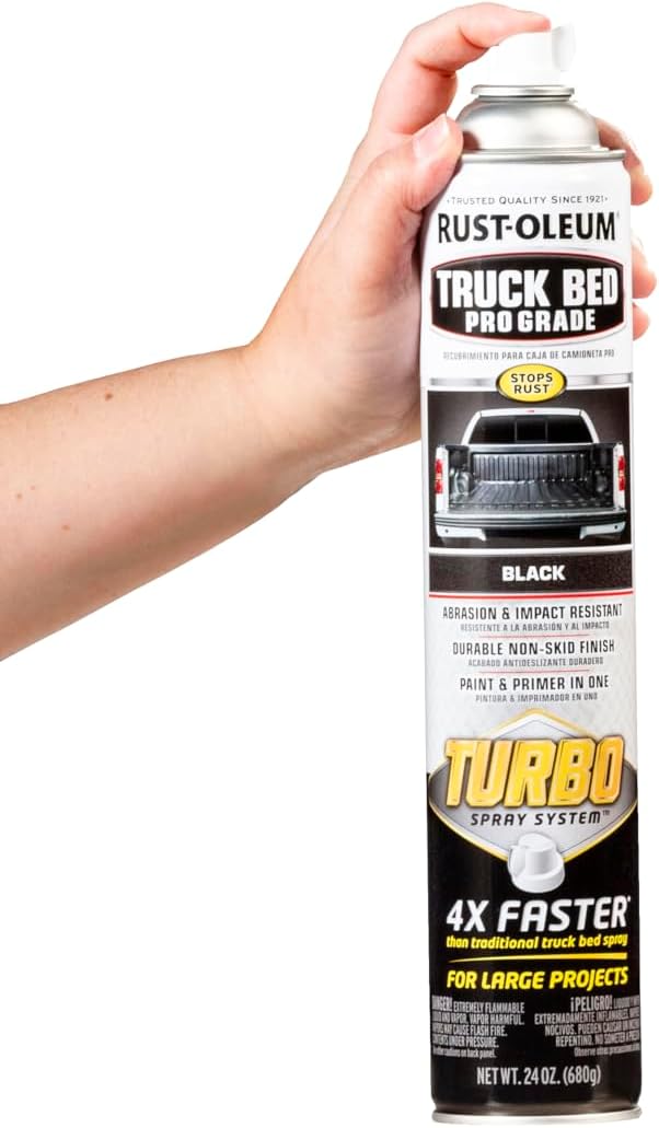 Rust-Oleum Professional Grade Truck Bed Coating with Turbo Spray System provides a durable, non-slip coating for truck beds with a revolutionary time saving delivery system. With a 10" wide spray pattern, Truck Bed Turbo offers professional grade coverage with more paint output and Stops Rust protection in an easy to use spray can without the need for expensive equipment. Use Rust-Oleum Turbo for fast spray paint projects and finish 4Xs faster. Protect your new truck bed or touch up the existing truck bed coating with long lasting resistance to scratches, weather, fading, rust and more. Works on any metal truck bed or other metal trim including running boards, bedrails and more for a premium finish.