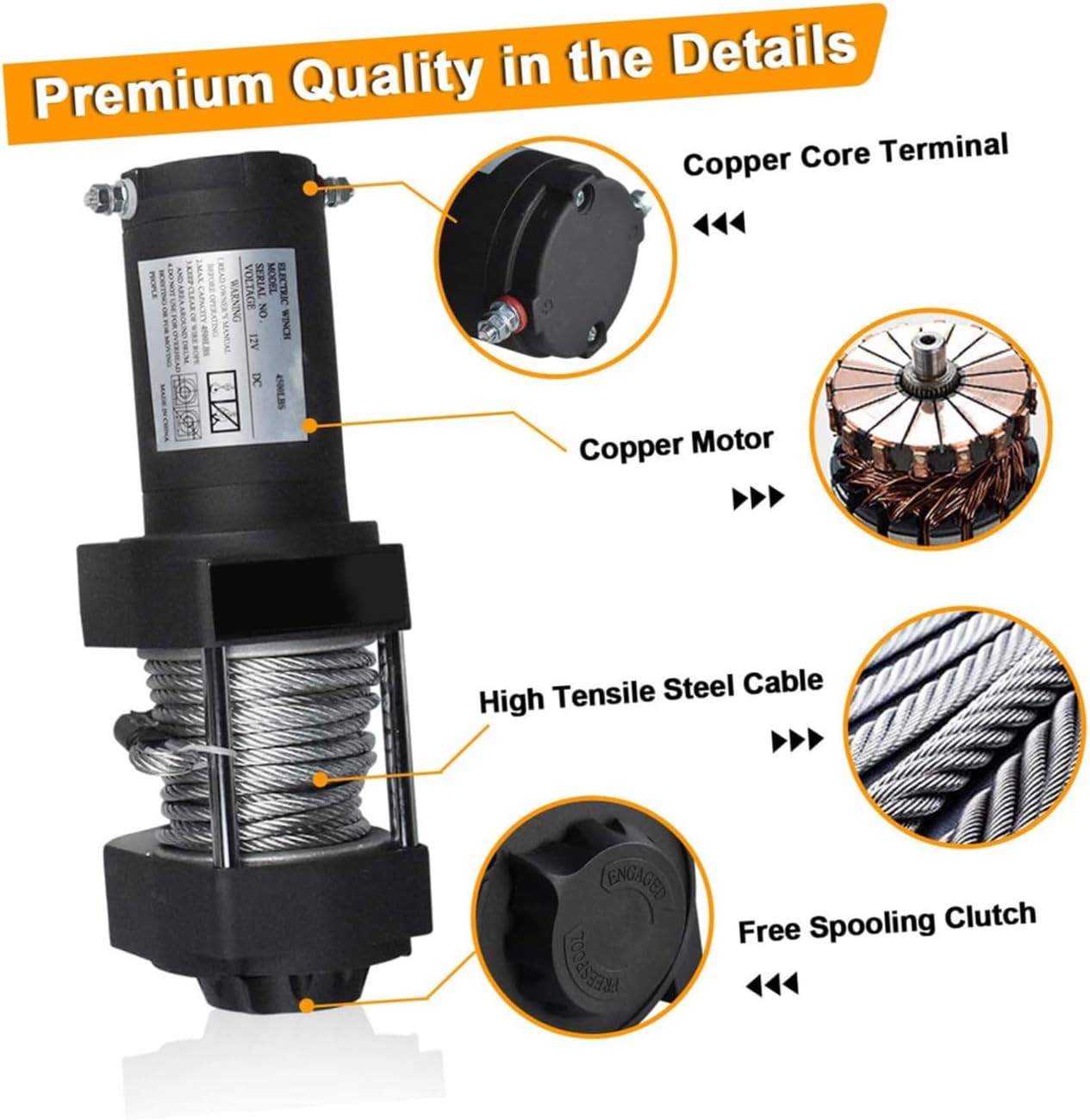 Package List 1 x electric winch 1 x Characteristics -Size: 26.00X10.00X10.00cm/ 10.22X3.93X3.93in. -Color: Assorted Color. -Product Info:Electric winch - Voltage: 12V trailer winch. -Tensile force: 1361kg 12 volt winch. -Material: Copper. - Made of material, durable and useful. - It will be your best partner on the muddy road winch. - This makes it for winching vehicles through water and winching boats rc crawler winch. - Special designed for ATV, UTV, car, boat, modified vehicles and multi purpose utility trailers electric winch. - Good conductivity and low heat generation.Goods Descriptioncrawler winch The copper core terminal is used, which is not suitable for corrosion and has good conductivity.rc winch with remote Are you looking for an efficient and useful electric winch? Then our product is one of your .trailer winch Made of , strong and durable