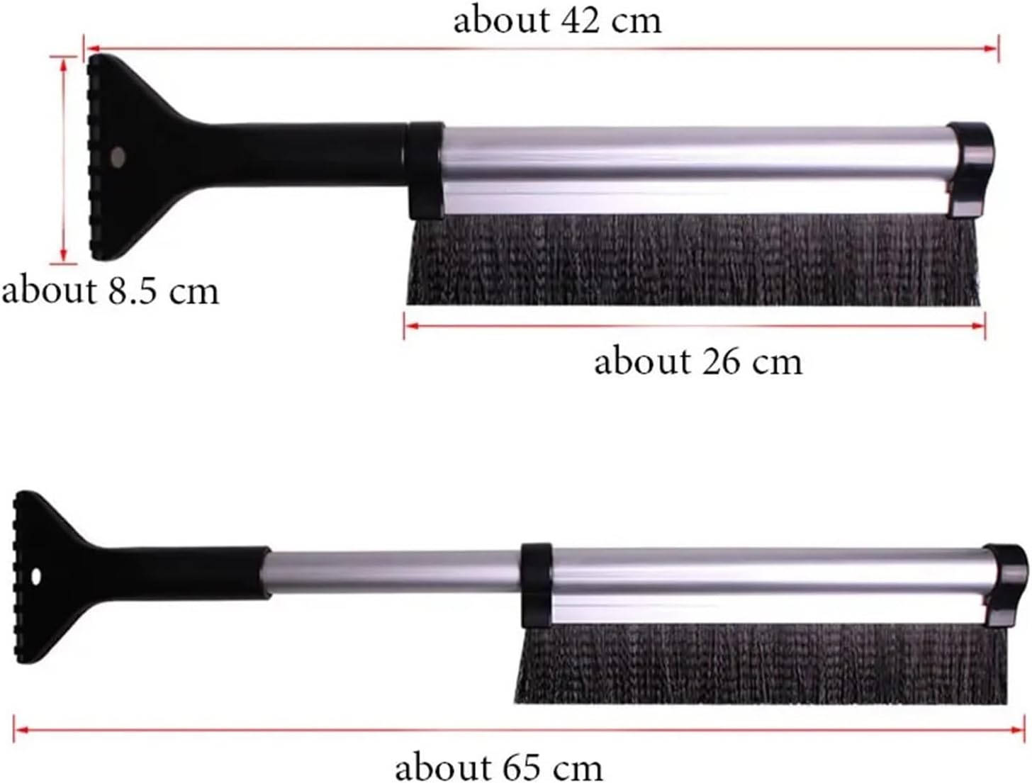 Size: 42.2 × 8.5 × 3cm (65cm after extension)Material: ABSFit for vehicle type: General purposeInstructions for Use:1. Hold the frost shovel handle so that the shovel head is close to the windshield;2. Formation of the rear side of the blade and the glass10degree-70Degree angle;3Remove frost by moving up and down or left and right.Product Features:nylon brush: low temperature resistance, obvious snow-removing effect and no damage to the paintSnow removal shovel head: using ABS high-strength plastic casting forming, hard and solid, low-temperature performance is good, can shovel snowthe design of snow guide groove makes snow removal cleanerInside the handle is a high-quality aluminum rod, high strength, good toughnessTelescopic aluminum alloy pull rod, freely adjustable in length, convenient to clean ice and snow, suitable for various modelsDual-purpose shovel, easy to get rid of winter ice and snow, car maintenance is essentialIn addition to removing snow and frost from cars, electric cars, bicycles and snow-covered houses, glass doors and windows can also be swept away.
