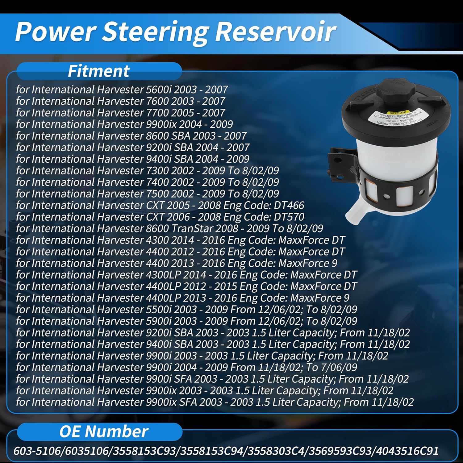 • [Fitment] This Power Steering Tank for International Harvester 4300 14-16 Eng Code: MaxxForce DT, for International Harvester 4400 12-16 Eng Code: MaxxForce DT, for International Harvester 4400 13-16 Eng Code: MaxxForce 9, for International Harvester 7300 02-09 To 8/02/09, for International Harvester 7400 02-09 To 8/02/09, for International Harvester 7500 02-09 To 8/02/09, OE Number:603-5106/6035106/3558153C93/3558153C94/3558303C4/3569593C93/4043516C91.