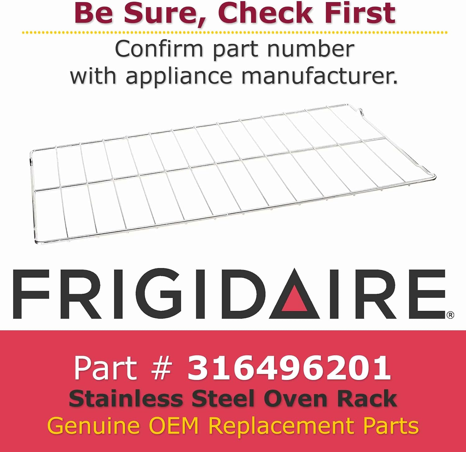 Product Description This high quality Genuine OEM Frigidaire Oven Rack (316496201) provides a stable surface for cookware inside the oven. The Stainless Steel Oven Rack is 16 inches by 24.25 inches. High quality Frigidaire OEM 316496201 Range Oven Rack replaces part numbers 316404501, 316496202. Please be aware that it is recommended to use protective saftey equipment and disconnect the appliance from all utilities prior to installation of the Oven Rack.Some Compatible Range Models: FGEX26D6QF0, FFHS2622MB0, FFHS2622MB1, FFHS2622MB2, FFHS2622MB3, FFHS2622MB4, FFHS2622MB5, FFHS2622MB7, FFHS2622MB8, FFHS2622MB9, FFHS2622MBA, FFHS2622MBB, FFHS2622MBC, FFHS2622MBD, FFHS2622MBE, FFHS2622MBF, FFHS2622MBG, FFHS2622MBH, FFHS2622MBJ, FFHS2622MBL, FFHS2622MBMA, FFHS2622MBPA, FFHS2622MBQA, FFHS2622MH0, FFHS2622MH1, FFHS2622MH2, FFHS2622MH3, FFHS2622MH5, FFHS2622MH6, FFHS2622MH8, FFHS2622MH9, FFHS2622MHA, FFHS2622MHB, FFHS2622MHE, FFHS2622MHF, FFHS2622MHH, FFHS2622MM0, FFHS2622MM1, FFHS2622MM2, FFHS2622MM3, FFHS2622MM5, FFHS2622MM6, FFHS2622MM7, FFHS2622MM8, FFHS2622MM9, FFHS2622MMA, FFHS2622MMB, FFHS2622MMD, FFHS2622MME, FFHS2622MMF, FFHS2622MMH, FFHS2622MQ0, FFHS2622MQ1, FFHS2622MQ2, FFHS2622MQ3, FFHS2622MQ5, FFHS2622MQ9, FFHS2622MQA, FFHS2622MQB, FFHS2622MQC, FFHS2622MQD, FFHS2622MQF, FFHS2622MQG, FFHS2622MQJ, FFHS2622MS0, FFHS2622MS1, FFHS2622MS2, FFHS2622MS3, FFHS2622MS4, FFHS2622MS5, FFHS2622MS7, FFHS2622MS8, FFHS2622MS9, FFHS2622MSA, FFHS2622MSB, FFHS2622MSC, FFHS2622MSE, FFHS2622MSF, FFHS2622MSG, FFHS2622MSH, FFHS2622MSJ, FFHS2622MSL, FFHS2622MSM, FFHS2622MSN, FFHS2622MSP, FFHS2622MSR, FFHS2622MSS, FFHS2622MSVA, FFHS2622MSWA, FFHS2622MSXA, FFHS2622MSYA, FFHS2622MW0, FFHS2622MW1, FFHS2622MW2, FFHS2622MW3, FFHS2622MW4, FFHS2622MW5, FFHS2622MW7, FFHS2622MW8, FFHS2622MWA, FFHS2622MWB From the Manufacturer This is a genuine replacement part. The model number and name for the following item is: Frigidaire (FRIGB) 316496201 Oven Rack
