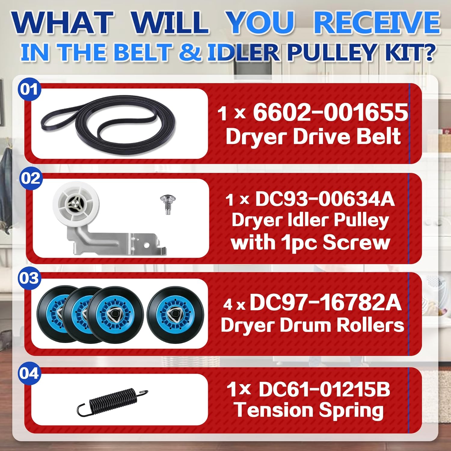 | Included Components | 1× DC61-01215B Tension Spring, 1× Dryer Drum Belt #6602-001655, 1× Dryer Idler Pulley #DC93-00634A, 4 x Dryer Drum Rollers #DC97-16782A |