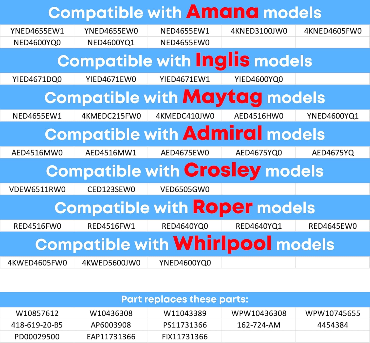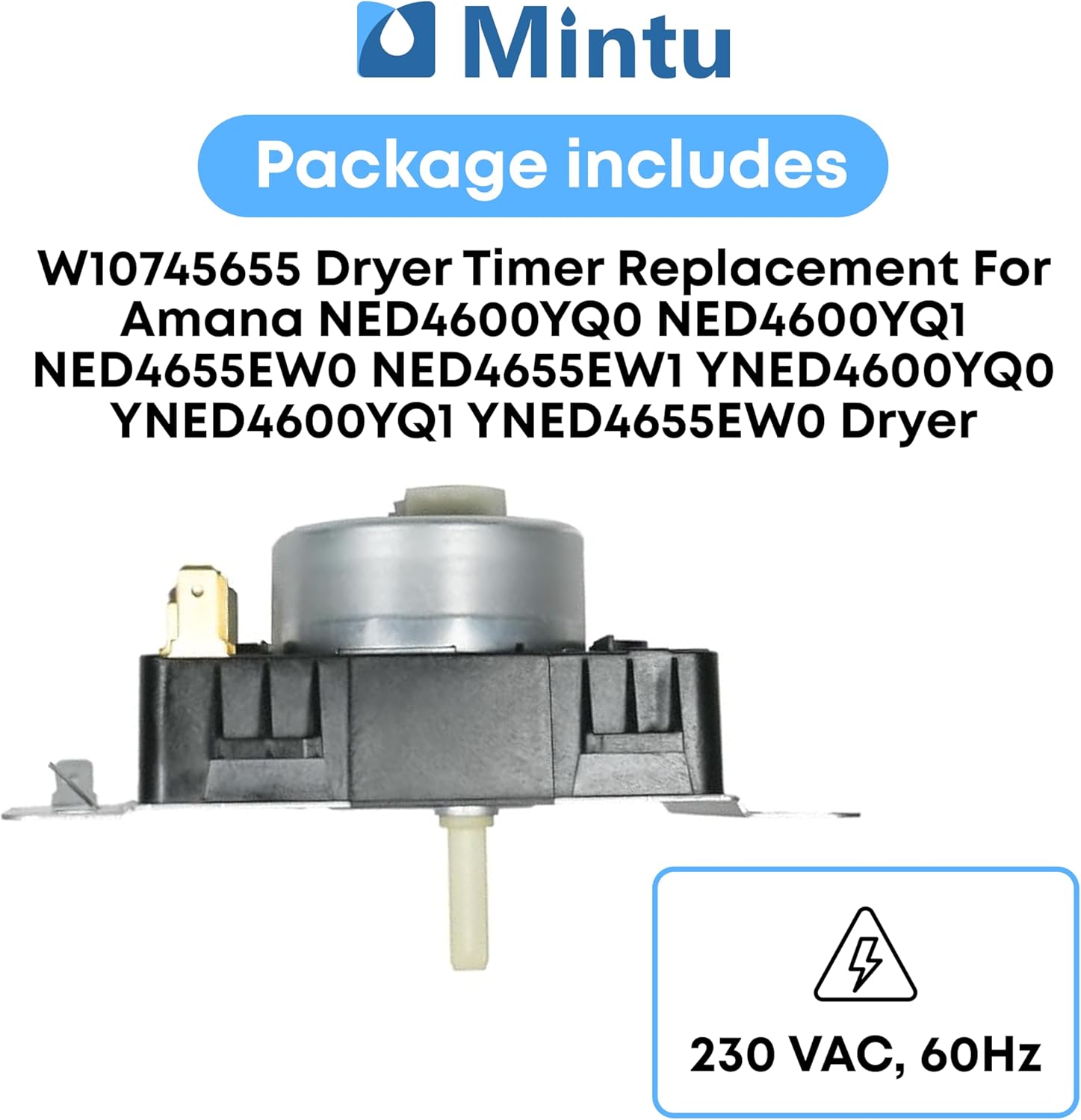 The W10745655 Dryer Timer is designed for reliable performance and precise control of your dryer cycles. Operating at 230VAC 60Hz, it regulates drying time to prevent overheating, protect clothes, and save energy. Built with a reinforced metal backplate, strong plastic housing, and heat-resistant internal parts, this timer ensures stability and durability for years of use. This part replaces W10857612, W10436308, W11043389, WPW10436308, WPW10745655, 418-619-20-B5, AP6003908, PS11731366, 162-724-AM, 4454384, PD00029500, EAP11731366, FIX11731366, PD00033692, 4461878, AP6040038, PS11773247, and EAP11773247. Compatible with a wide range of models, including YNED4655EW1, YNED4655EW0, NED4655EW1, 4KNED3100JW0, 4KNED4605FW0, NED4600YQ0, NED4600YQ1, YIED4671DQ0, YIED4671EW0, YIED4671EW1, YIED4600YQ0, 4KMEDC215FW0, 4KMEDC410JW0, AED4516MW0, AED4516MW1, AED4675EW0, AED4675YQ0, VDEW6511RW0, RED4516FW0, RED4516FW1, RED4640YQ0, RED4640YQ1, RED4645EW0, 4KWED4605FW0, 4KWED5600JW0, YNED4600YQ0. Whether your dryer won’t start, isn’t heating, stops mid-cycle, or has uneven drying, this timer is the proven solution. Easy to install with just basic tools, it restores your appliance’s performance quickly. Upgrade to the W10745655 Dryer Timer today and get your laundry routine back on track with confidence.