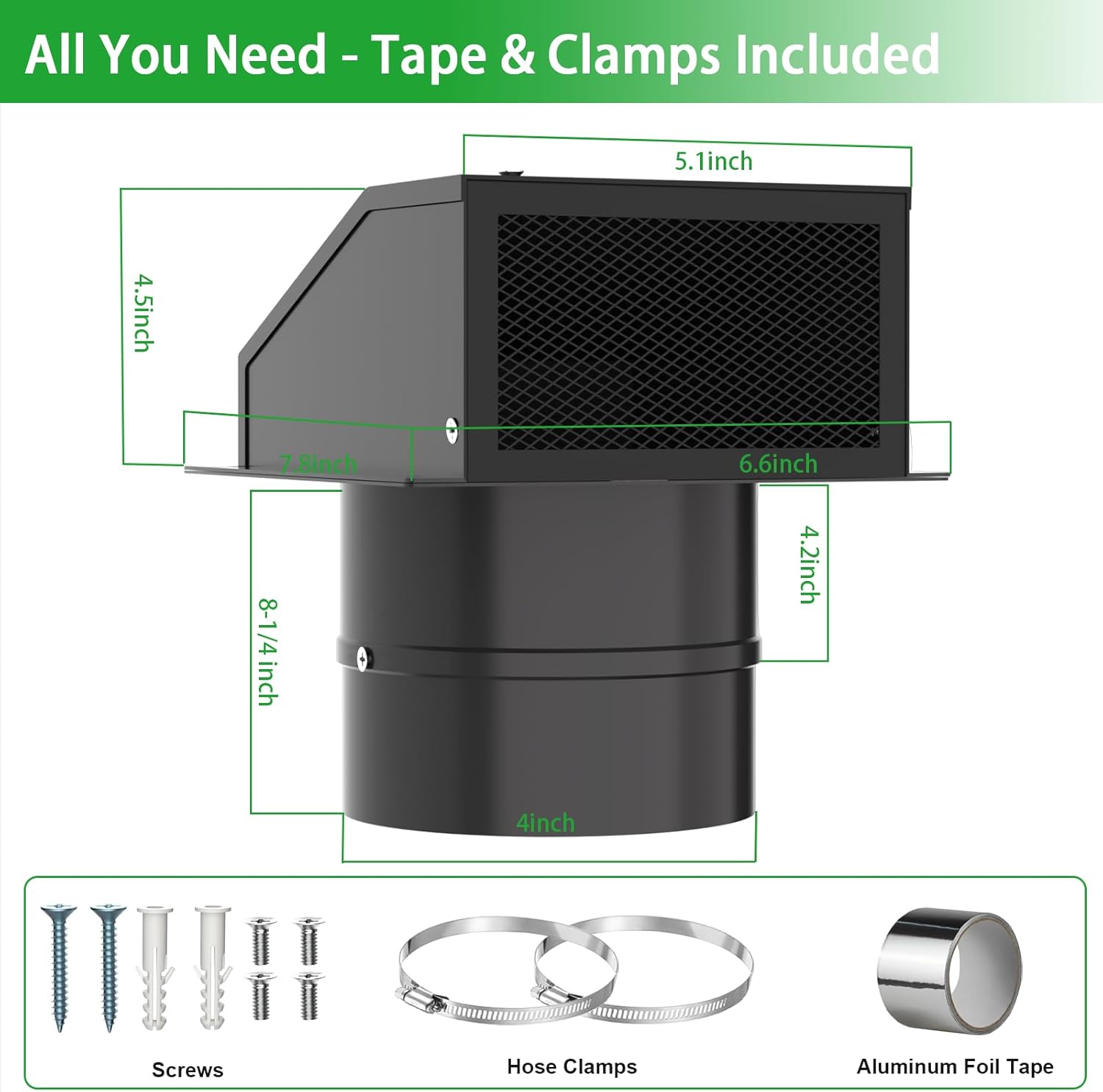 | Included Components | 4inch Hooded Wall Vent, aluminum foil tape, stainless steel duct clamp*2 |