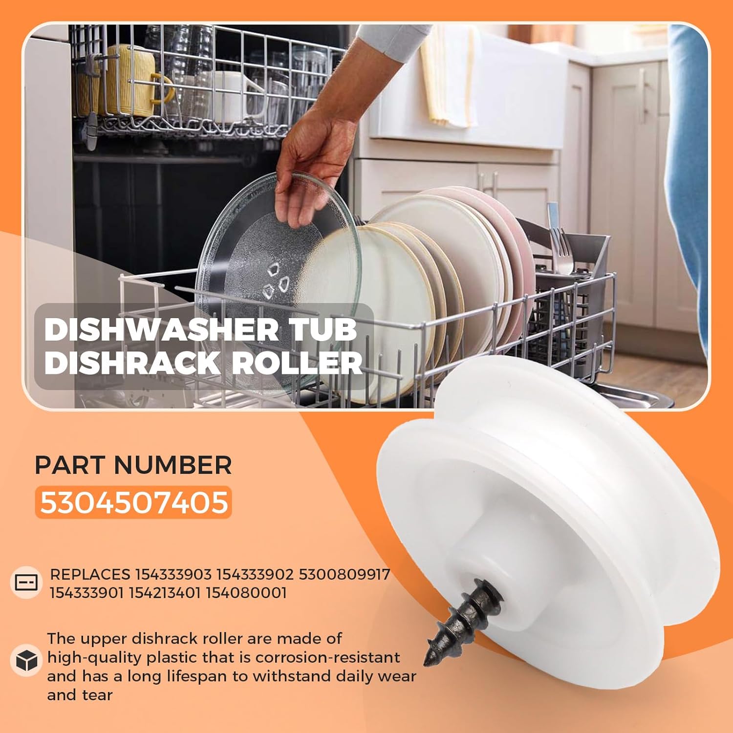 Part number 5304507405 Dishwasher roller tub Replaces 154333903 154333902 5300809917 154333901 154213401 154080001 Fitment: Dishwasher roller tub compatible with Crosley, Electrolux, Frigidaire, Gibson, Kelvinator, Kenmore, Tappan, and Westinghouse Dishwasher Compatible with models including:58716149405, 58716149401, 58716149402, 58716149403, 58716149404, FFBD2405KW1B, 58716149400, FFBD2405KW1A, WWBD2400HW0, 58715239901A, GLDB656JB0, GLDB656JB1, PLD3460RDC0, FFBD2405KW0A, 61-1120-10-00, FDB635RFS3, FDB635RFS4, FDB635RFS5, FDB635RFS6, FFBD2404NM0A, FDB635RFS0, FDB635RFS1, FDB635RFS2, FDBB944CS0, FDBB944CS1, SP550AXR1, FDB635RFR2, FDB635RFR3, FDB635RFR4, FDB635RFR5, FDB635RFR6, CDB400KW1B, FDB635RFR0, FDB635RFR1, 58717245990, GLDB954BS0, GLDB954BS1, 58717245991, 58714014404 Cost-Effective Solution for Extended Appliance Life: Instead of replacing the entire dishrack or calling for expensive repairs, upgrading with this Dishwasher Tub Dishrack Roller is a budget-friendly way to restore your dishwasher’s performance. It extends the life of your appliance, reduces the need for frequent maintenance, and ensures your dishrack operates like new—saving you time, money, and the stress of dealing with a malfunctioning dishwasher Effortless Use: The dishwasher upper dishrack roller reduces friction, preventing damage to both your dishes and dishwasher tub. Say goodbye to scratches and chipped plates Package: Including 4 pcs dishwasher tub dishrack roller Note: When installing the dishwasher tub dishrack roller, please cut off the power supply first