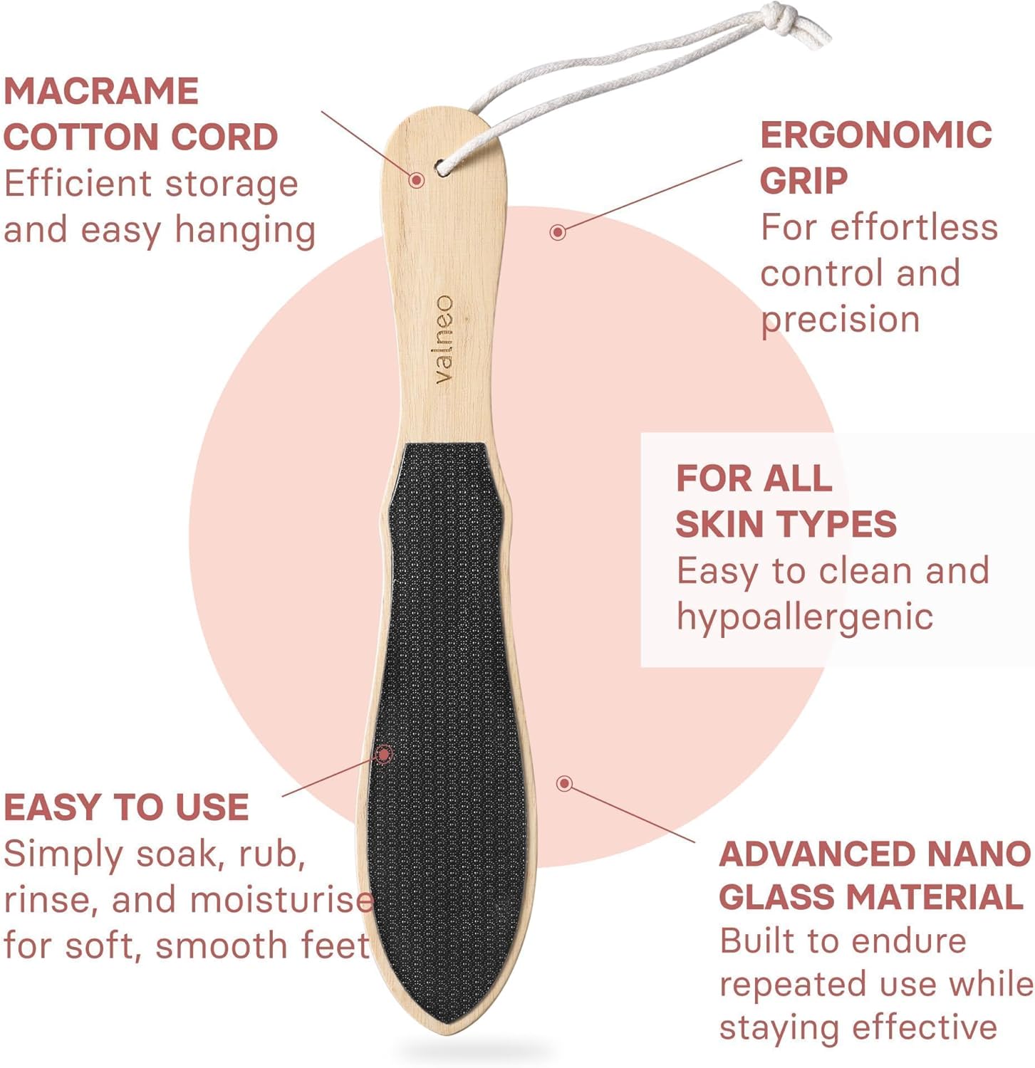 READY TO TRANSFORM YOUR FEET FROM ROUGH TO REMARKABLY SMOOTH?This foot hard skin remover by Valneo is the ultimate solution for rough, calloused feet. This game-changing tool combines the power of a foot exfoliator and the precision of a foot grater to provide the ultimate foot care experience. With durable nano glass, it effectively targets hard skin and calluses, leaving your feet feeling soft and rejuvenated. Its ergonomic wooden handle design makes it easy to use and ensures long-lasting use. Whether it's dry skin or stubborn calluses, this foot dead skin remover is designed to tackle it all. From heel to toe, this foot scrubber tool scrapes away dead skin and hard patches, revealing the soft skin underneath.HIGHLIGHTS:- Unbeatable hard skin remover- Precise foot exfoliator- Durable nano glass foot file - Effective calluses removerSPECIFICATIONSMeasurements: 11.38 x 2.24 x 0.47 inch | 28.9 x 5.7 x 1.2 cmWeight: 140g | 4.9 ozMaterials: Rubber wood handle, nano glass grids, makramee cordColours: Brown wood handle, black nano glassProduct Info1 x Nano glass foot file