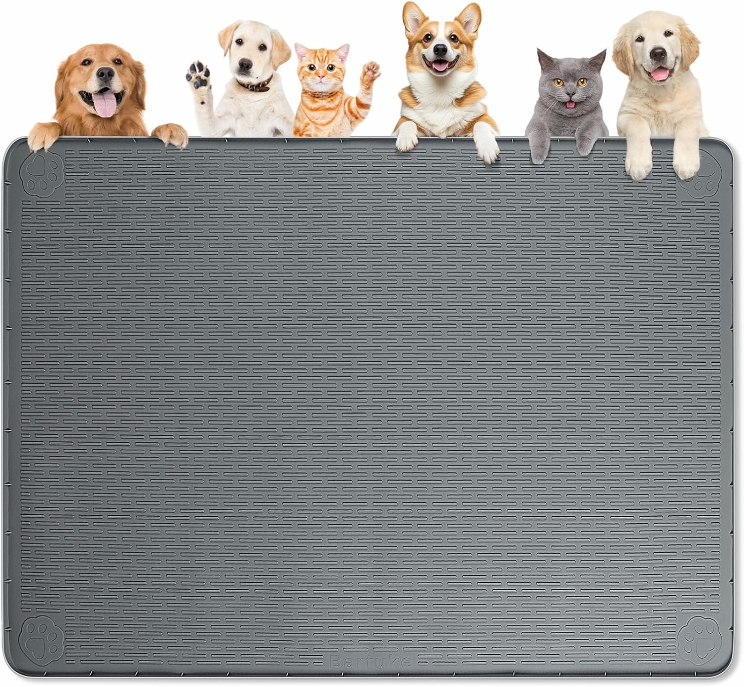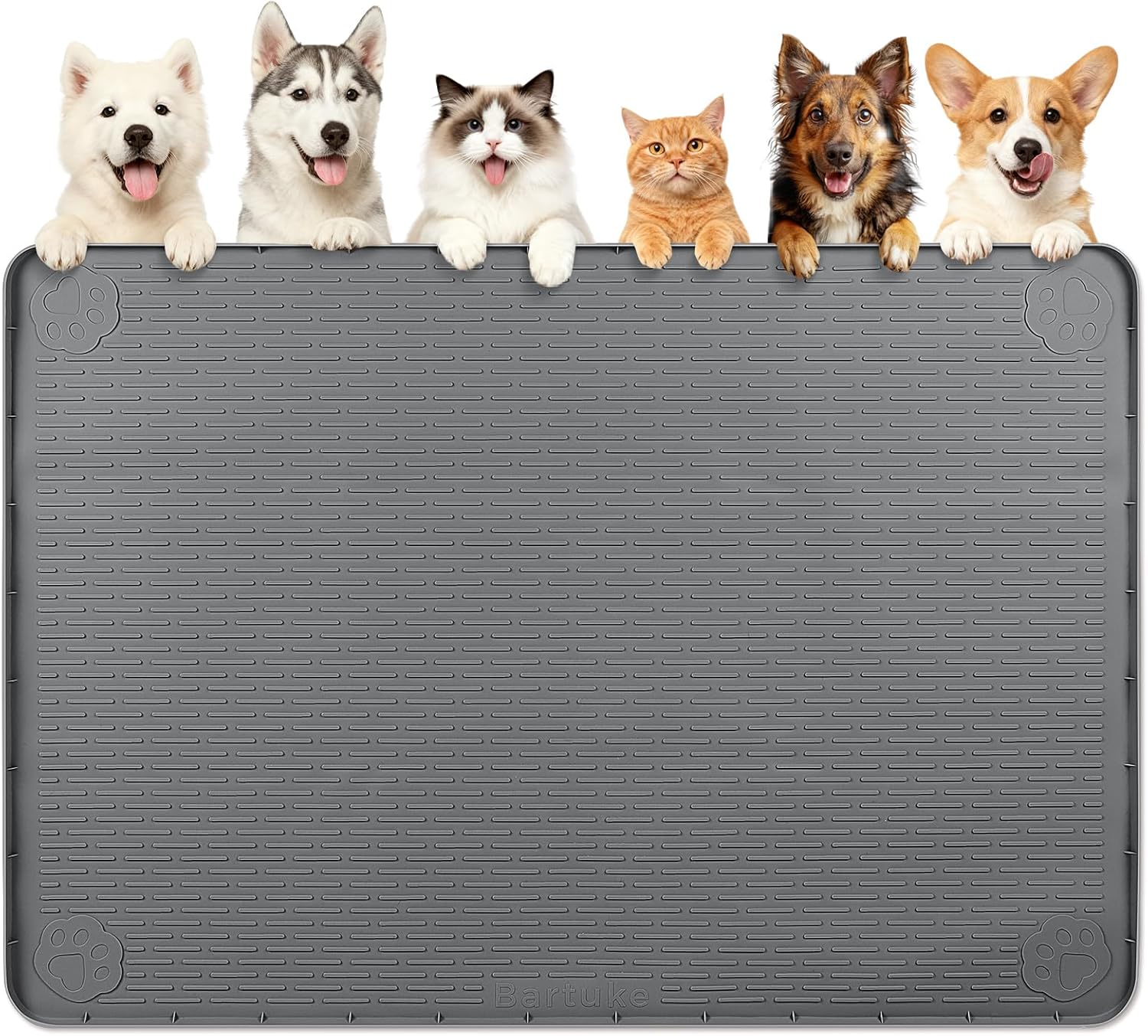 Bartuke Dog Food Mat, 57" x 40" Large Silicone Pet Feeding Mat with Raised Edge Pet Placemat for Food and Water Bowl - Ours feeding mat made of silicone for closer contact with the floor and better prevention of shifting. - The silicone dogfood mat mat has raised edges to help prevent spills from flowing onto the floor. - This pet food mat is foldable and very easy to store. Specification: Color: Green Size: 57" x 40"/145 x 101cm