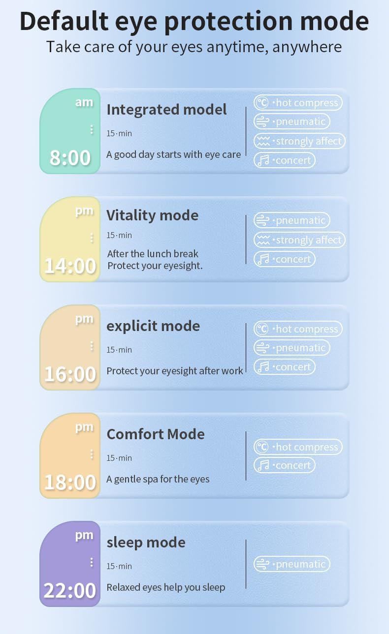 This innovative eye massager combines soothing heat therapy with gentle massage to help relieve eye strain and tension after long days at work or screen time. The sleek white and gray design features a comfortable, adjustable strap that fits most head sizes, ensuring a secure and personalized fit during your relaxation sessions. Built-in music functionality allows you to enhance your experience with calming sounds, while the rechargeable battery eliminates the hassle of constant battery replacements. The soft, cushioned padding provides a comfortable feel against your skin, making it perfect for use at home, in the office, or while traveling. Multiple massage modes let you customize your treatment to target specific pressure points around your eyes and temples. Whether you're dealing with tired eyes from computer work, headaches, or simply need a moment of relaxation, this eye massager delivers a spa-like experience in the comfort of your own space. The intuitive control panel makes it easy to adjust settings and switch between modes with just a few button presses.