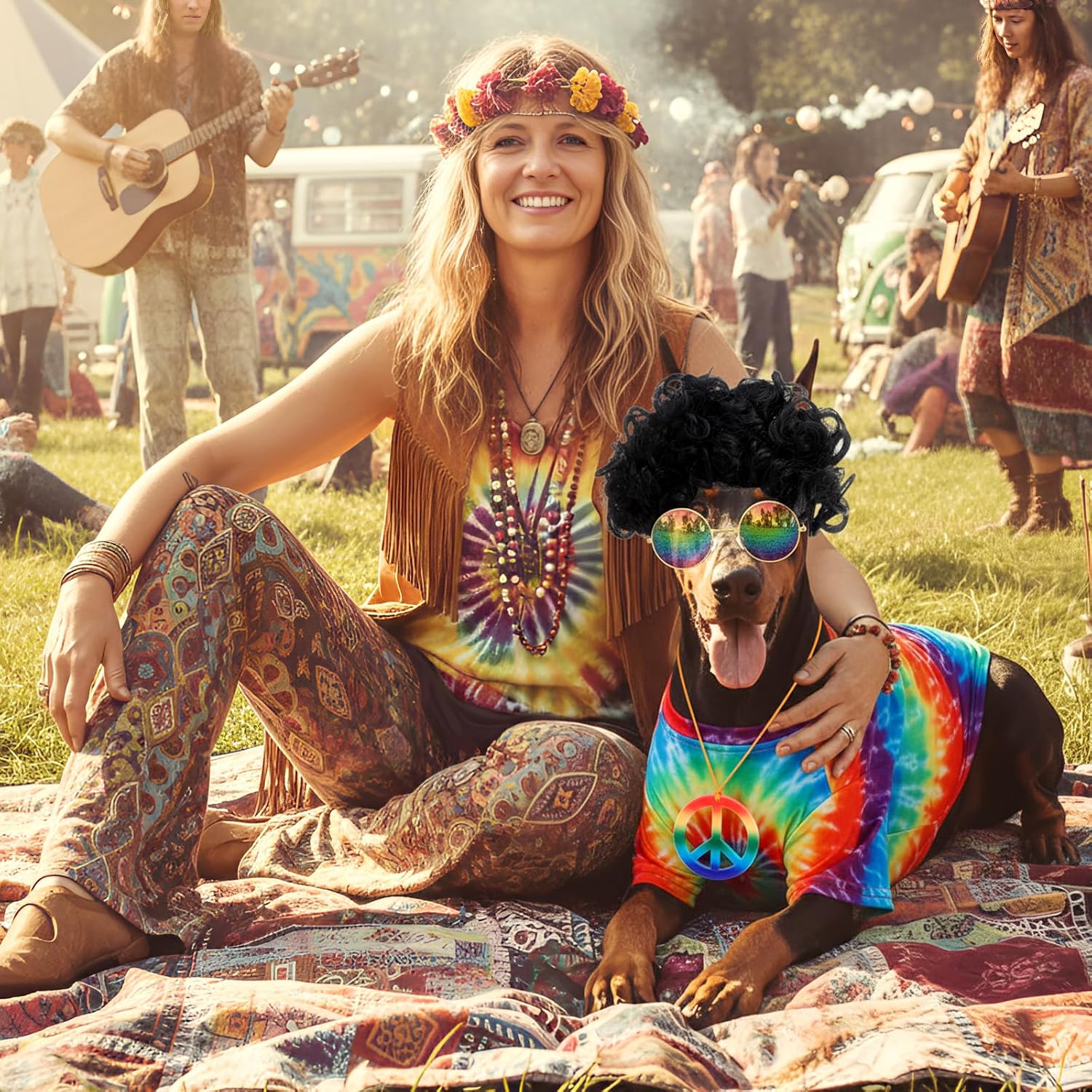 Features: Designed for convenience, each piece in this dog costume set is easy to put on and secure. The Halloween costume accessories, including the dog wig and peace sign necklace, feature adjustable elements, offering quick and effortless dress up experiences for both pets and owners. Deck out your loyal companion in this dog costume set and watch them steal the spotlight. From carnivals to Halloween, it's a way to amplify your pet's charm, celebrating the spirit of peace, love, and pure joy, truly making them an eye-catching wonder. Specifications: Material: plastic Color: multicolored Size: large(L) Package includes: 1 x Hippie sunglasses 1 x Peace sign necklace 1 x Wig 1 x T-shirt Notes: Manual measurement, please allow slight errors on size. The color may exist a slight difference due to different screen displays Before purchase, confirm whether the product size is suitable for your pet, and observe the pet's reaction when using. Please remove the product in time if there is any discomfort